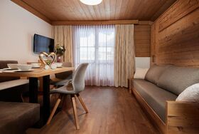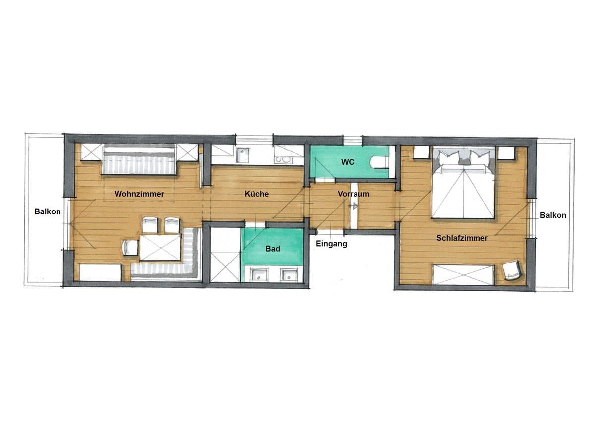• Wohnbereich mit Balkon, klappbarem Doppelbett und Schiebetüre