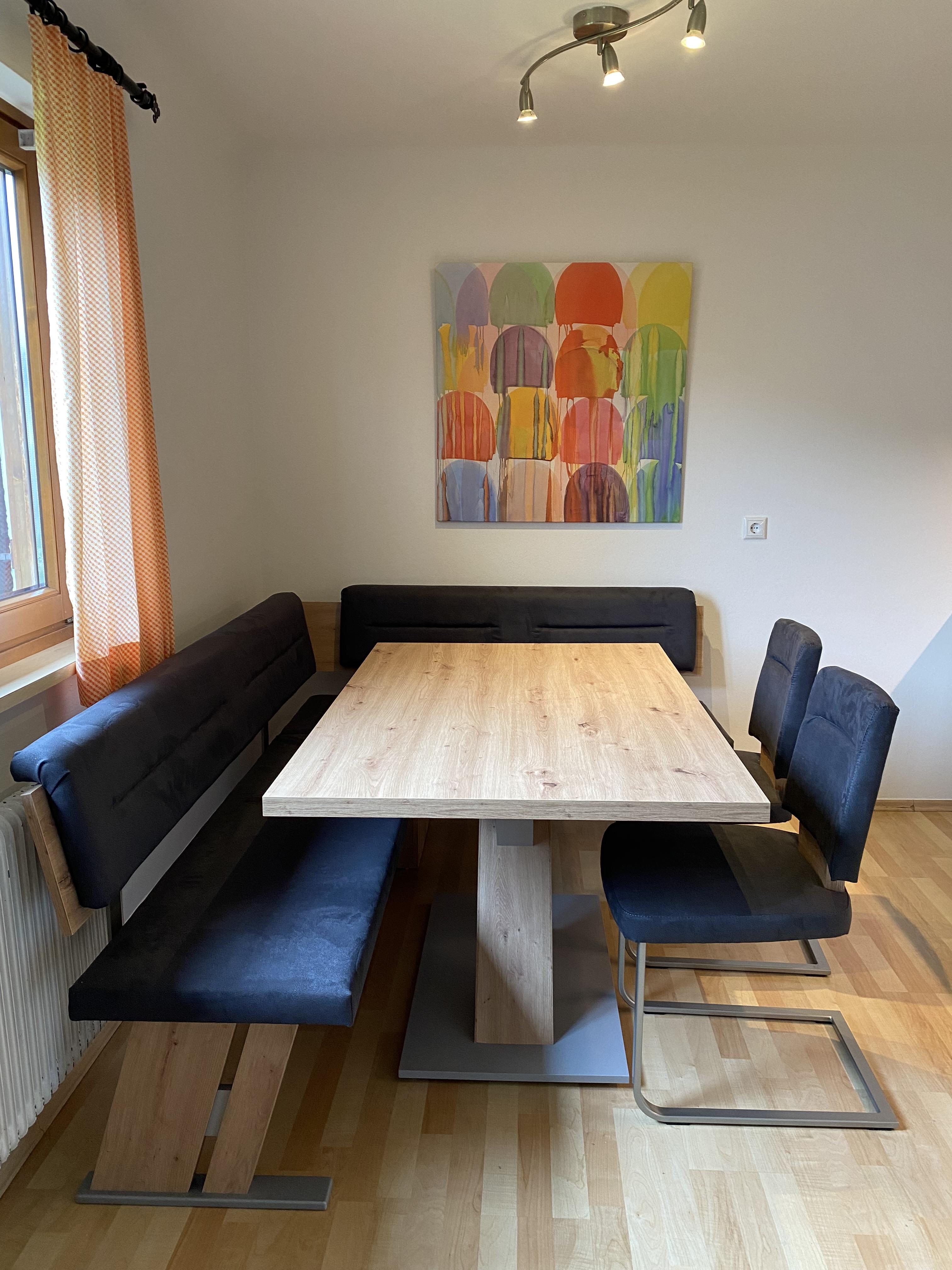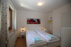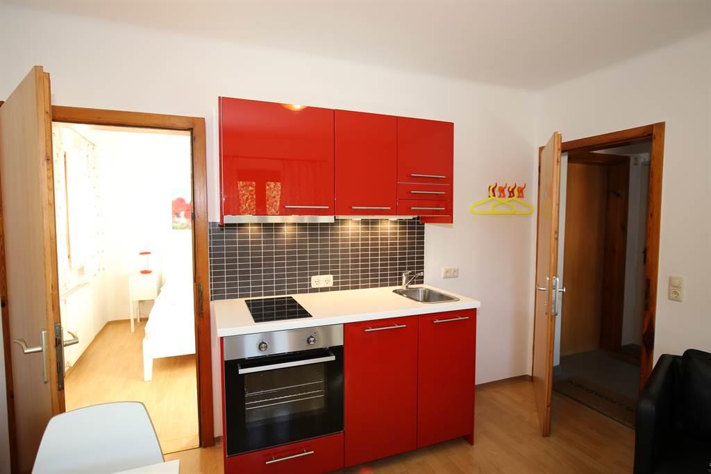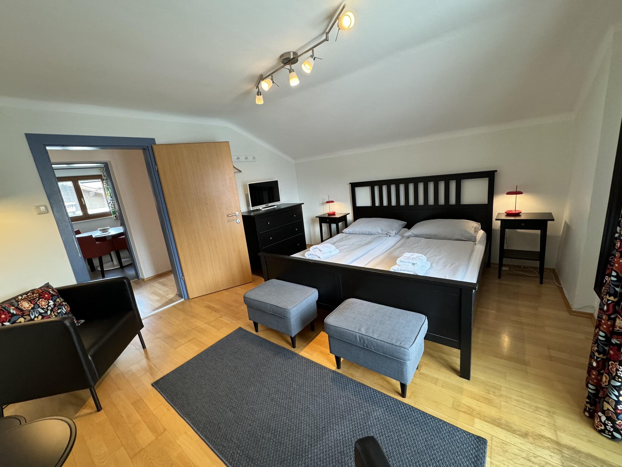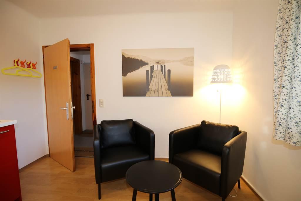 Helle Räumlichkeiten mit einer neuen und hochwertigen Ausstattung und Terasse (zugang von draußsen). Im Wohnzimmer befindet sich einen Esstisch, eine gemütlicher Sitzgruppe und eine Kochnische mit Kochplatten und Backofen, Geschirrspüler und einer Mikrowelle. Im Schlafzimmer befindet sich ein Doppelbett.