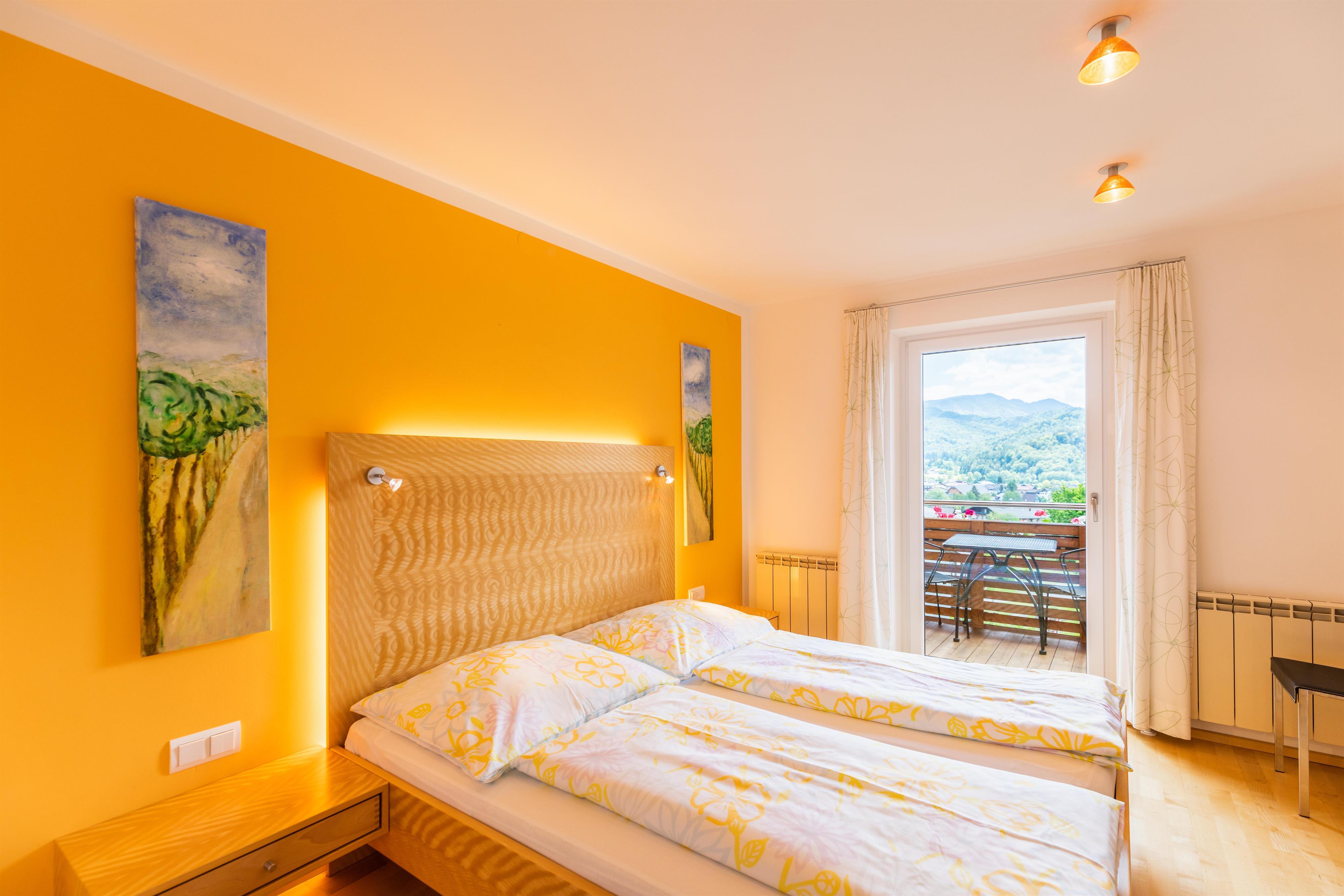 Gemütlich eingerichtetes Zimmer mit Balkon, der eine traumhafte Aussicht bietet.