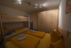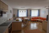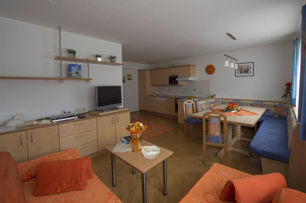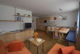Gemütliche Wohnküche mit Fernesehcouch und Eßecke. 1 Schlafzimmer mit Doppelbett und 2 Stockbetten. Durch Schiebetüre vom Wohnbereich trennbar. Dusche,WC. Große Terasse.