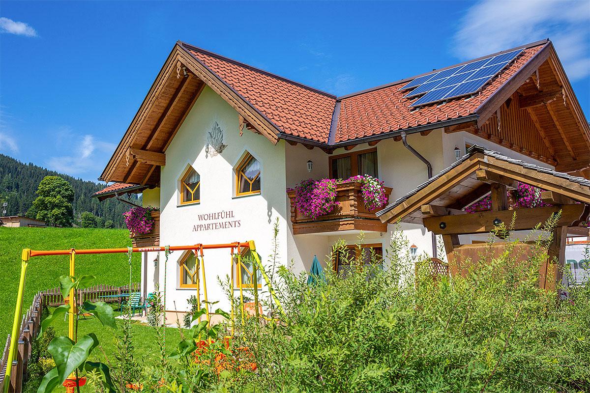 Das Haus liegt Nahe dem Zentrum, Skilift (Talstation Star Jet I), der gratis Skibus-Haltestelle und direkt an der Loipe. Die Wohlfühl-Appartements mit Kachelofen, für 2 bis 7 Personen sind im hochwertig, ländlichen Stil eingerichtet und bestens ausgestattet (W-LAN, Geschirrspüler, Backofen, Fön, Kabel-Flat-TV,...). Im Winter: beheizter Skiraum mit Schuhtrockner, Rodelverleih.