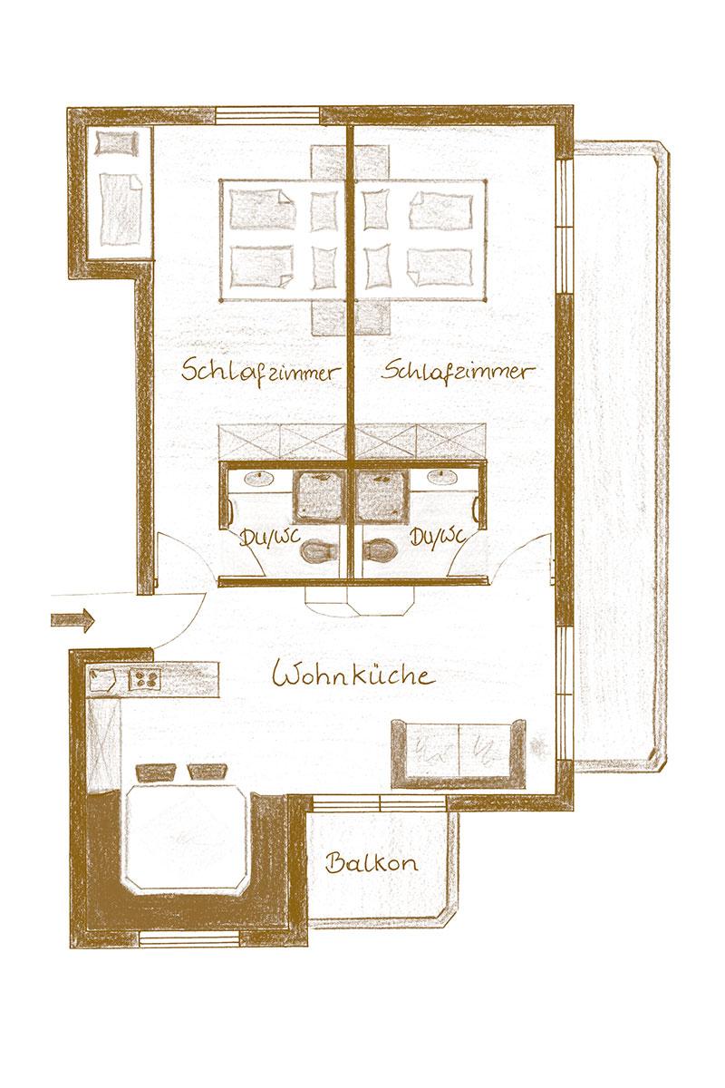 Die mit Liebe eingerichtete Nichtraucher-Ferienwohnung verfügt über 2 getrennte Schlafzimmer (3 und 4 Betten möglich) jeweils mit Dusche/WC und 2 Privatbalkonen mit herrlichem Ausblick. Weiters einem großzügigen Wohnbereich mit Küche- und Essecke, einem heimligen Kachelofen und einer ausziehbaren Doppelcouch. Vorhanden sind: Flat-Kabel-TV, Radio, Safe, Föhn; Küchenzeile mit Geschirrspüler, Backofen, Spülbecken, Kochplatten, Kühlschrank mit Gefrierfach, Mikrowelle, Kaffeemaschine, Wasserkocher, Toaster, Inventar, Bettwäsche, Bade- und Handtücher, Geschirrtücher und Spülmittel, ...
