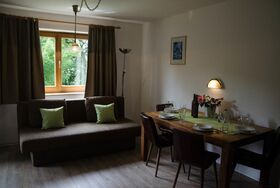 * Wohnraum mit gemütlicher Essecke und Schlafcouch (2 Personen), Flat-TV (Kabel-TV)