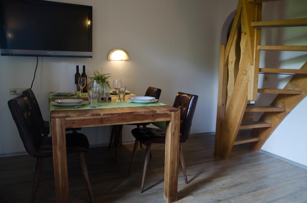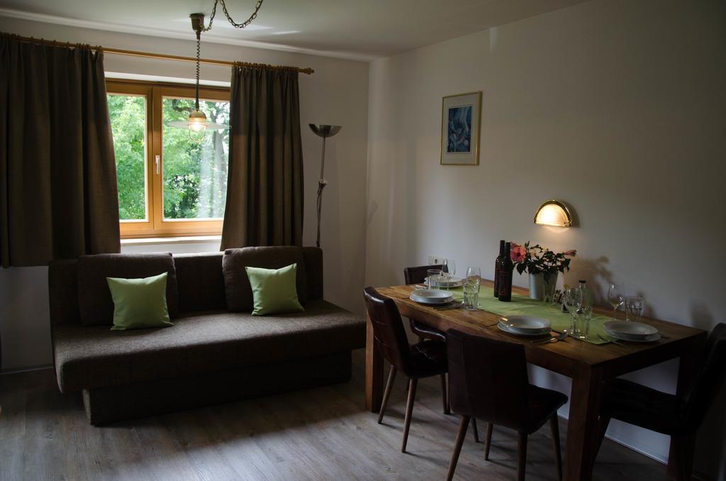 * Wohnraum mit gemütlicher Essecke und Schlafcouch (2 Personen), Flat-TV (Kabel-TV)