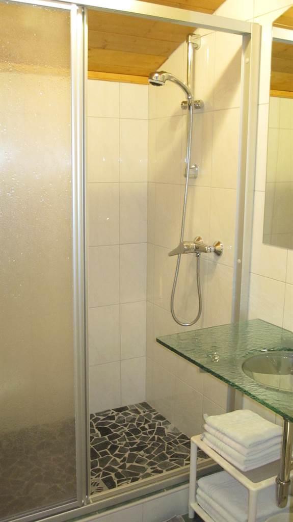 * Badezimmer mit Dusche, Waschbecken und Haartrockner