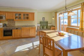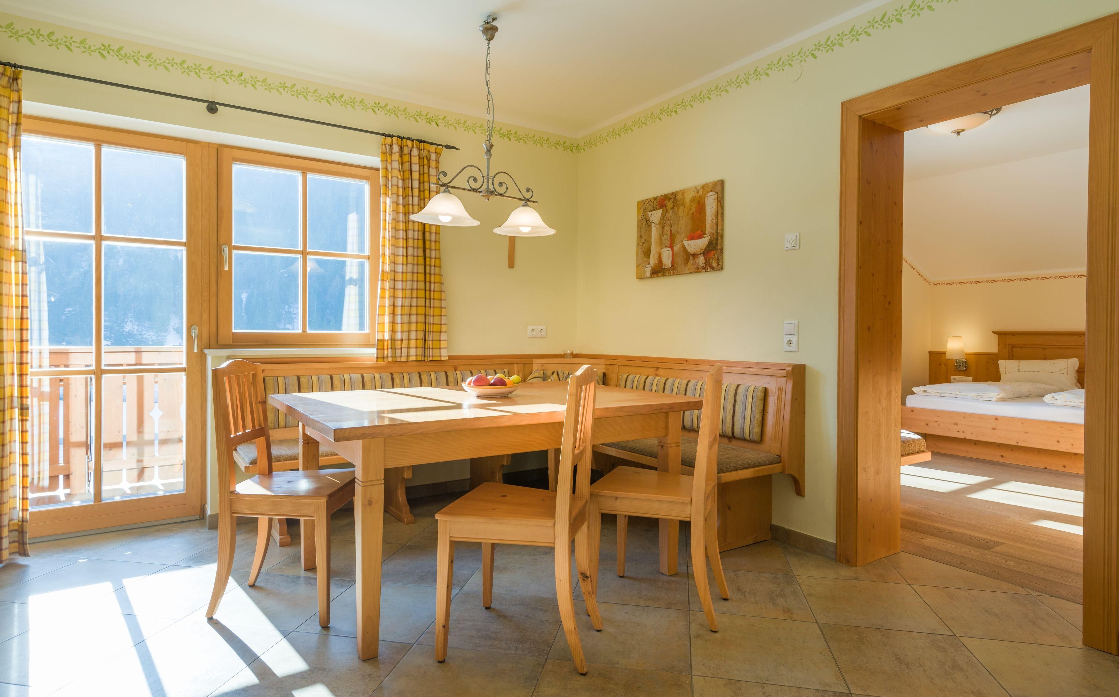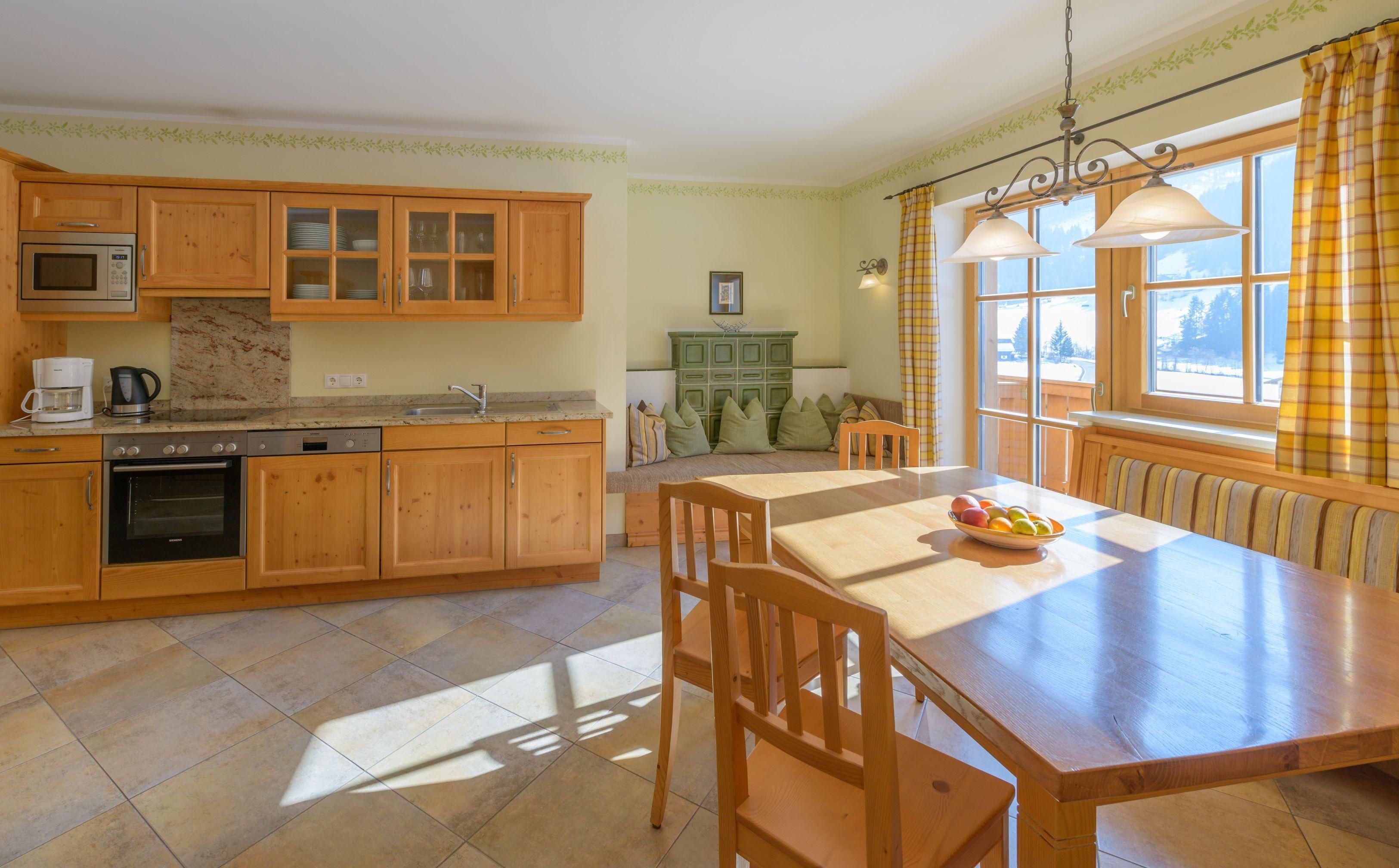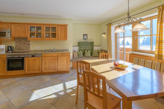 Apartment - Zirmegg, 85m², zwei Dreibettzimmer mit jeweils Dusche/WC, ein Kinderzimmer und große Wohnküche. Komplett ausgestattete Küchenzeile, Sitzecke für bis zu 10 Personen, beheizter Kachelofen mit gemütlicher Ofenbank, Flachbildschirm mit Kabel - TV und Internetanschluss. Vom eigenen Balkon genießt man einen wunderbaren Ausblick in die Kleinarler Berge, auch auf die namensgebende Zirmegg-Alm. Tipp: Auf www.schwabhof.info können sie eine virtuelle Tour durch unseren Hof und unsere Wohnungen machen!