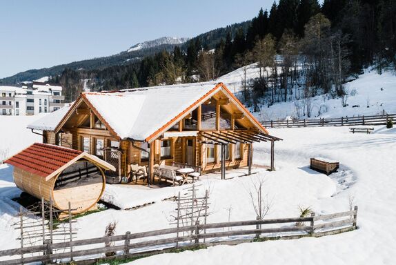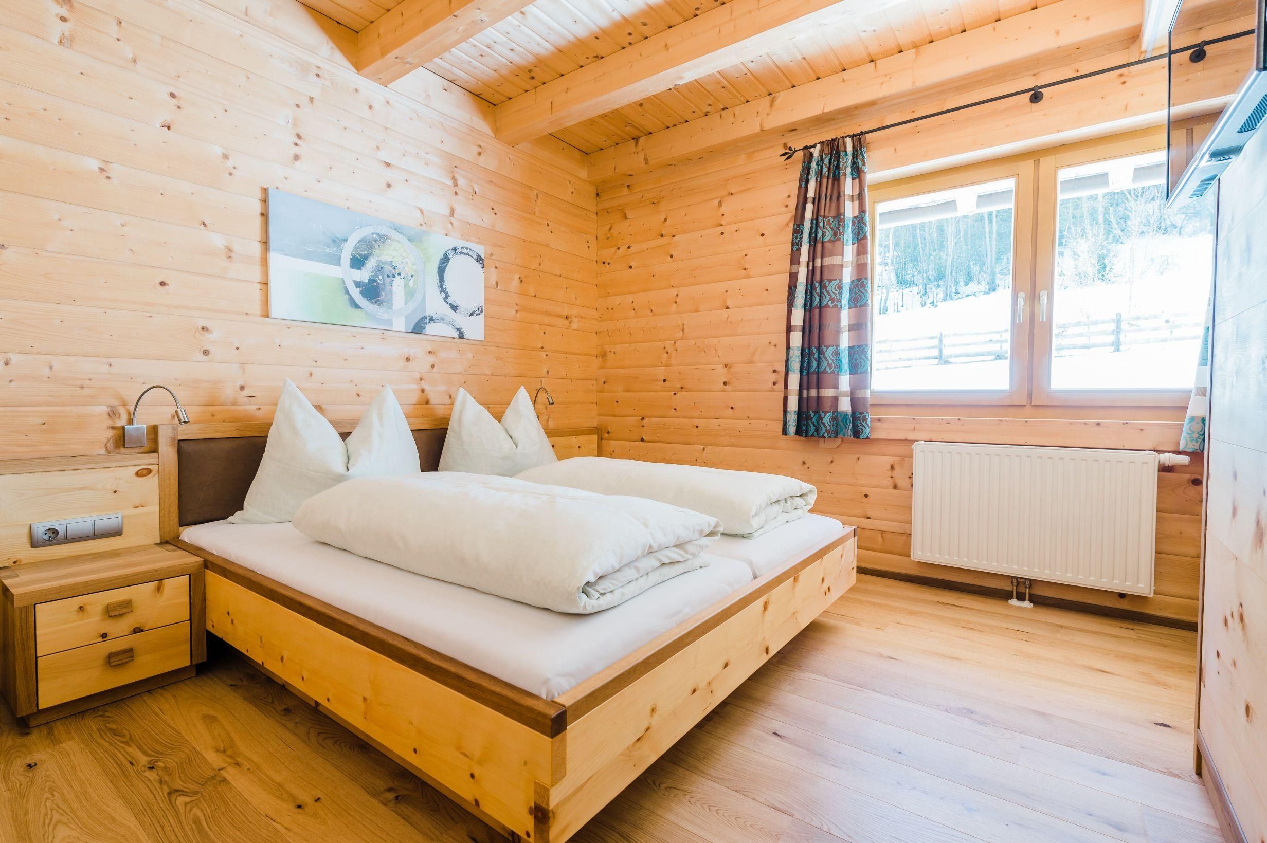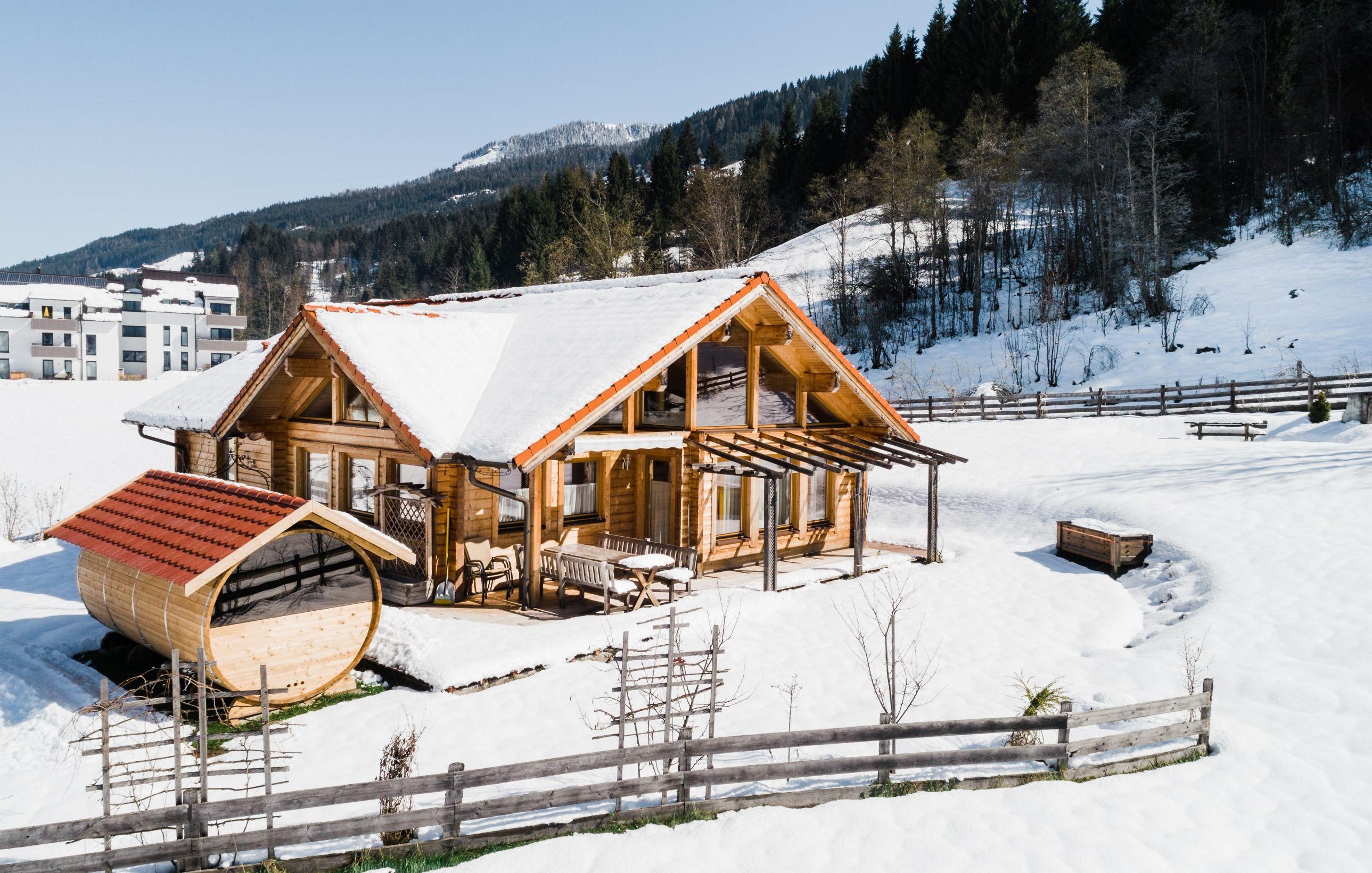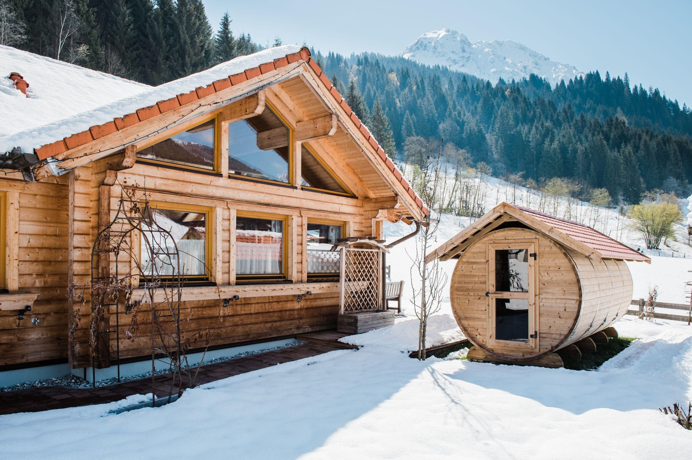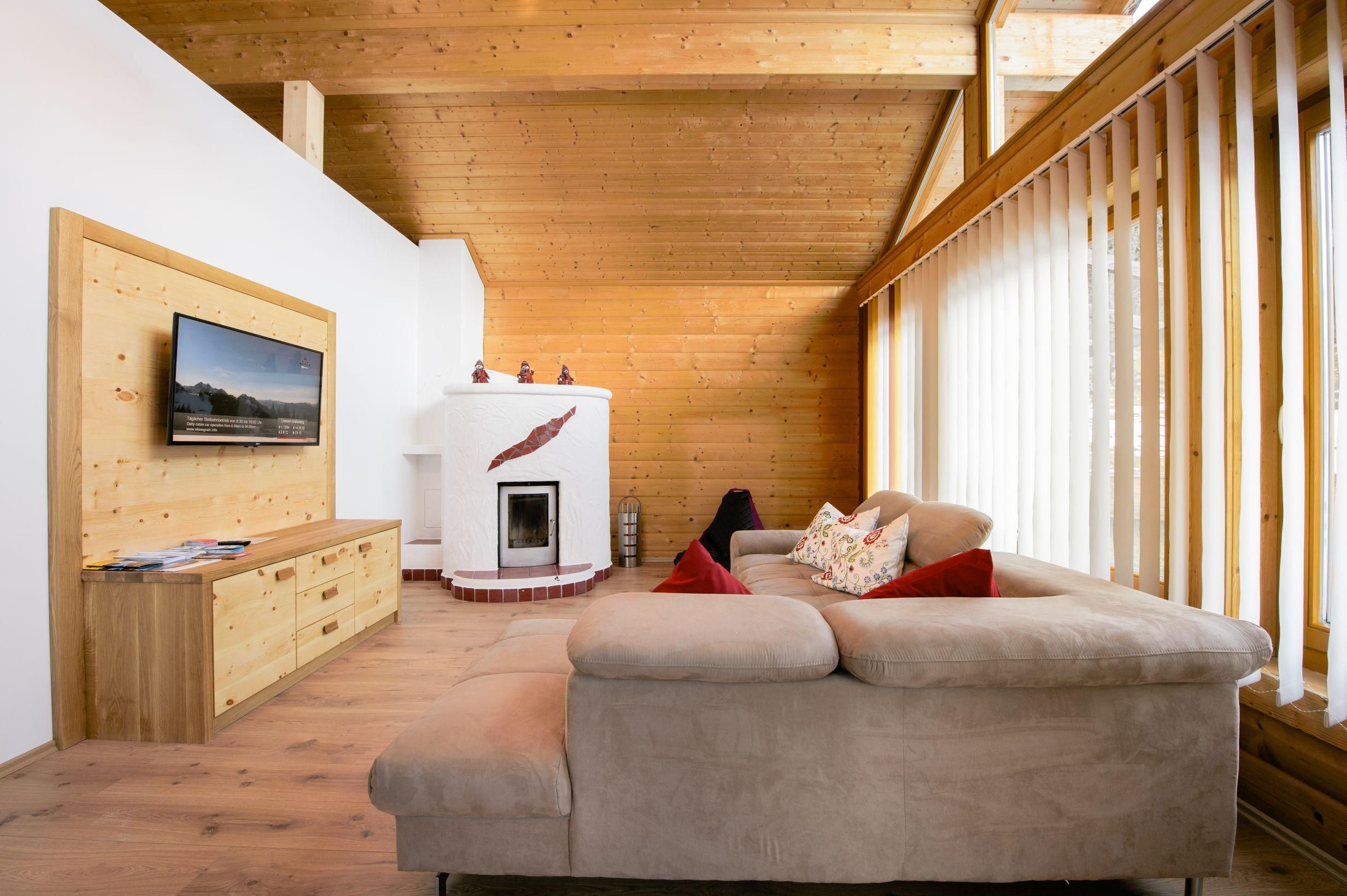 Das besondere Holzblockhaus, möbliert mit wohlriechendem Zirbenholz Wohnzimmer mit Kamin, riesiger Couch, Flatscreen und Kabel-TV Schi- und Schuhraum, Waschmaschine überdachte Terrasse und großer Garten, Sauna, Carport Großes Bad mit Wanne und Dusche