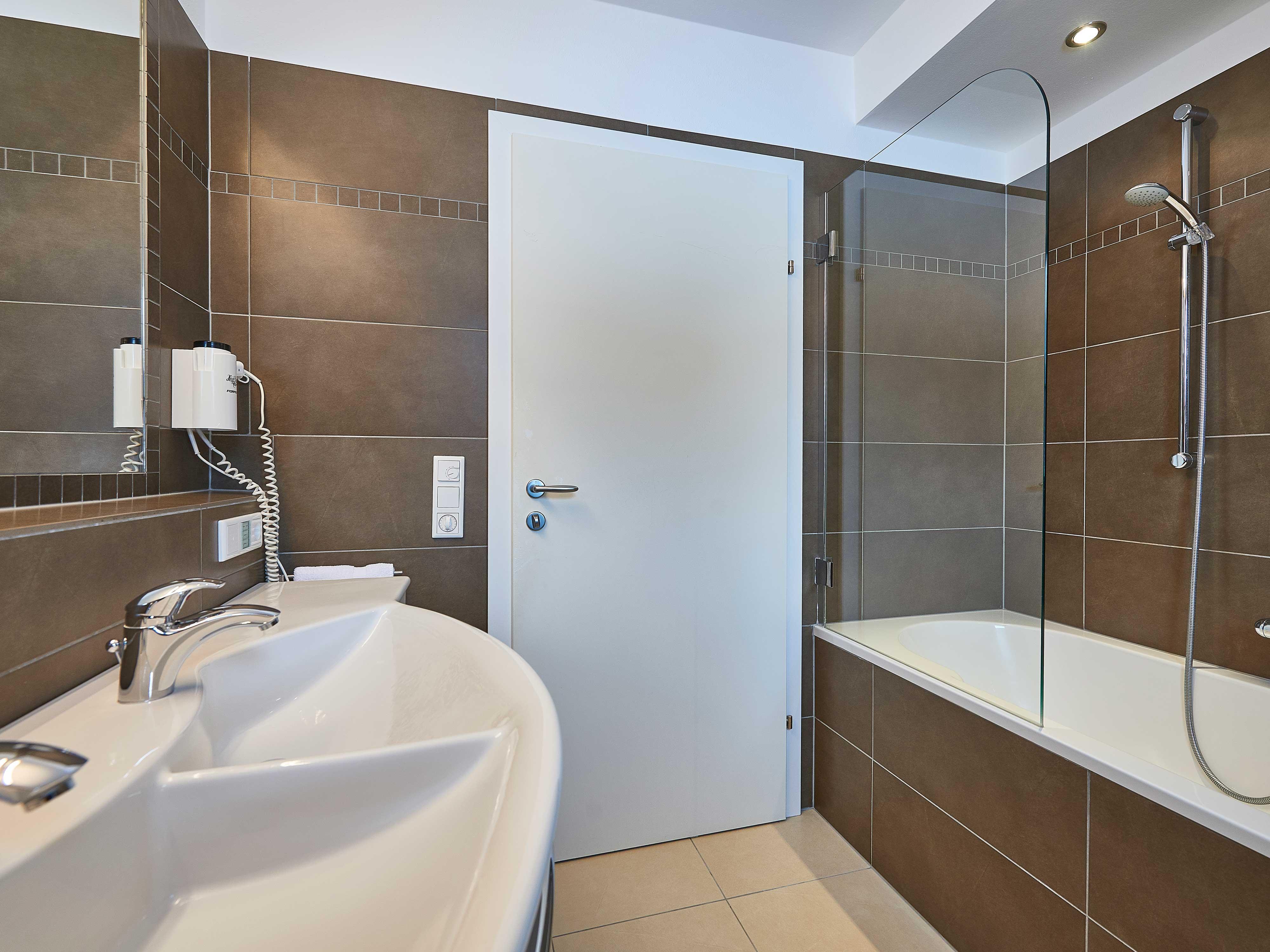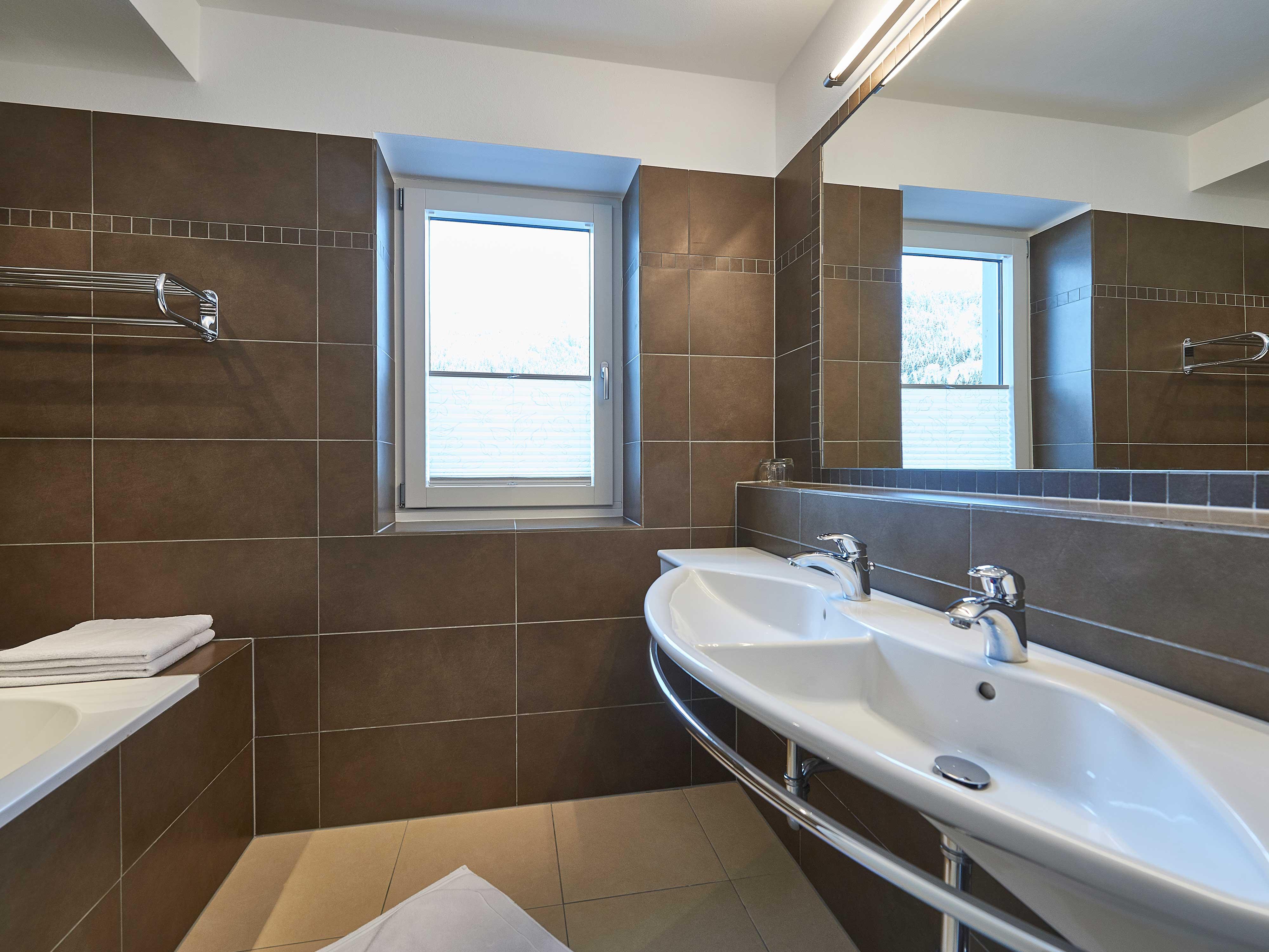 • Badezimmer mit Doppelwaschbecken und Badewanne