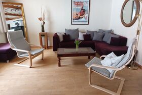 - gemütliches Wohnzimmer mit Kachelofen, Sofa, KabelTV