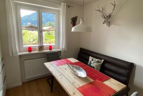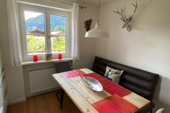 Ferienwohnung im 1. Stock eines Einfamilienhauses. Voll ausgestattete Küche inkl. Tschibo Kapsel-Kaffeemaschine+Kaffeevollautomat, Wasserkocher, Mikrowelle, Induktionsherd mit Backrohr, Soda Stream, Kühlschrank mit Gefrierfach. Resch & Frisch Aufbackofen für Brot (Brot erhältlich bei Billa plus in Saalfelden oder auf Vorbestellung).