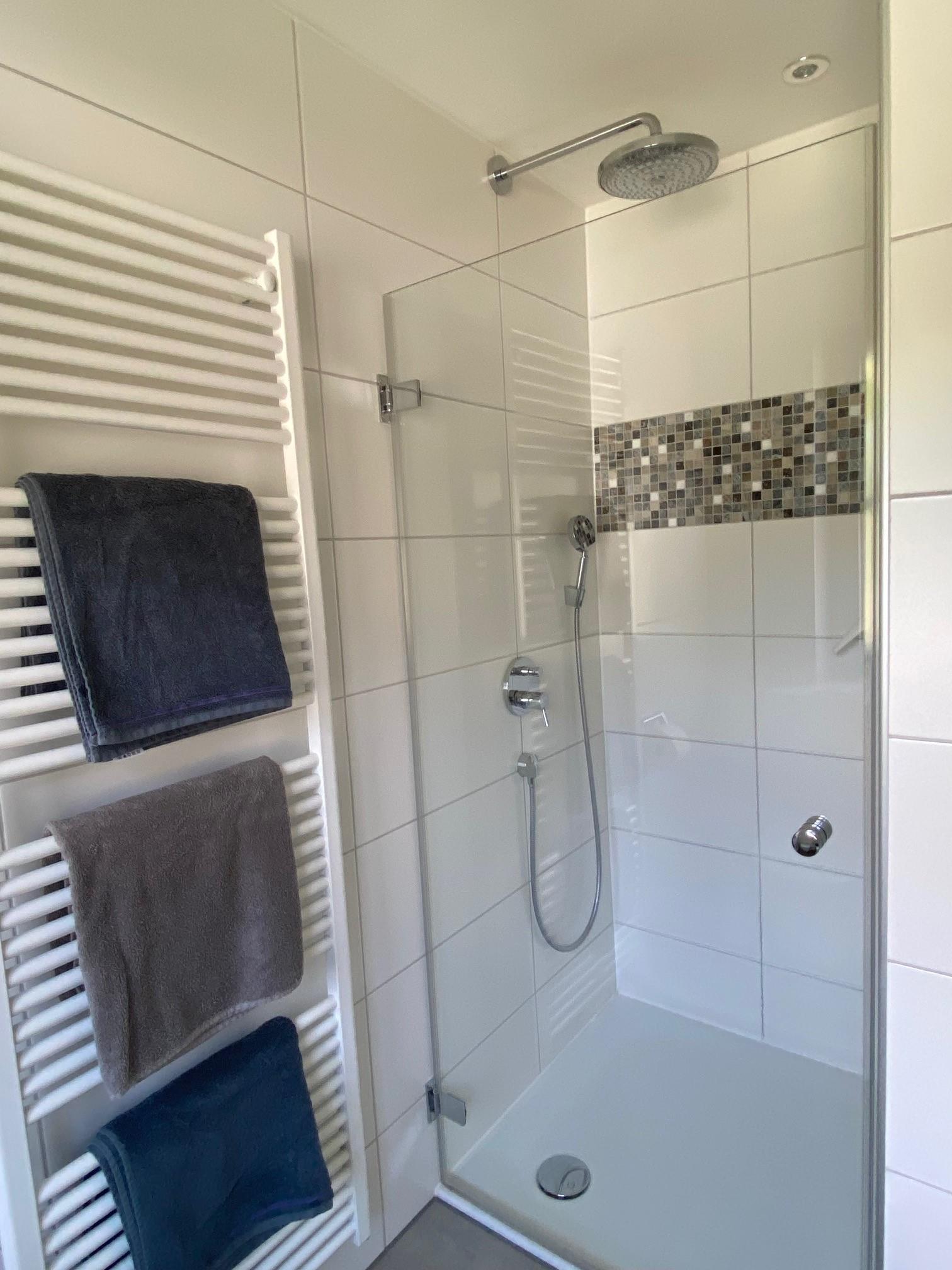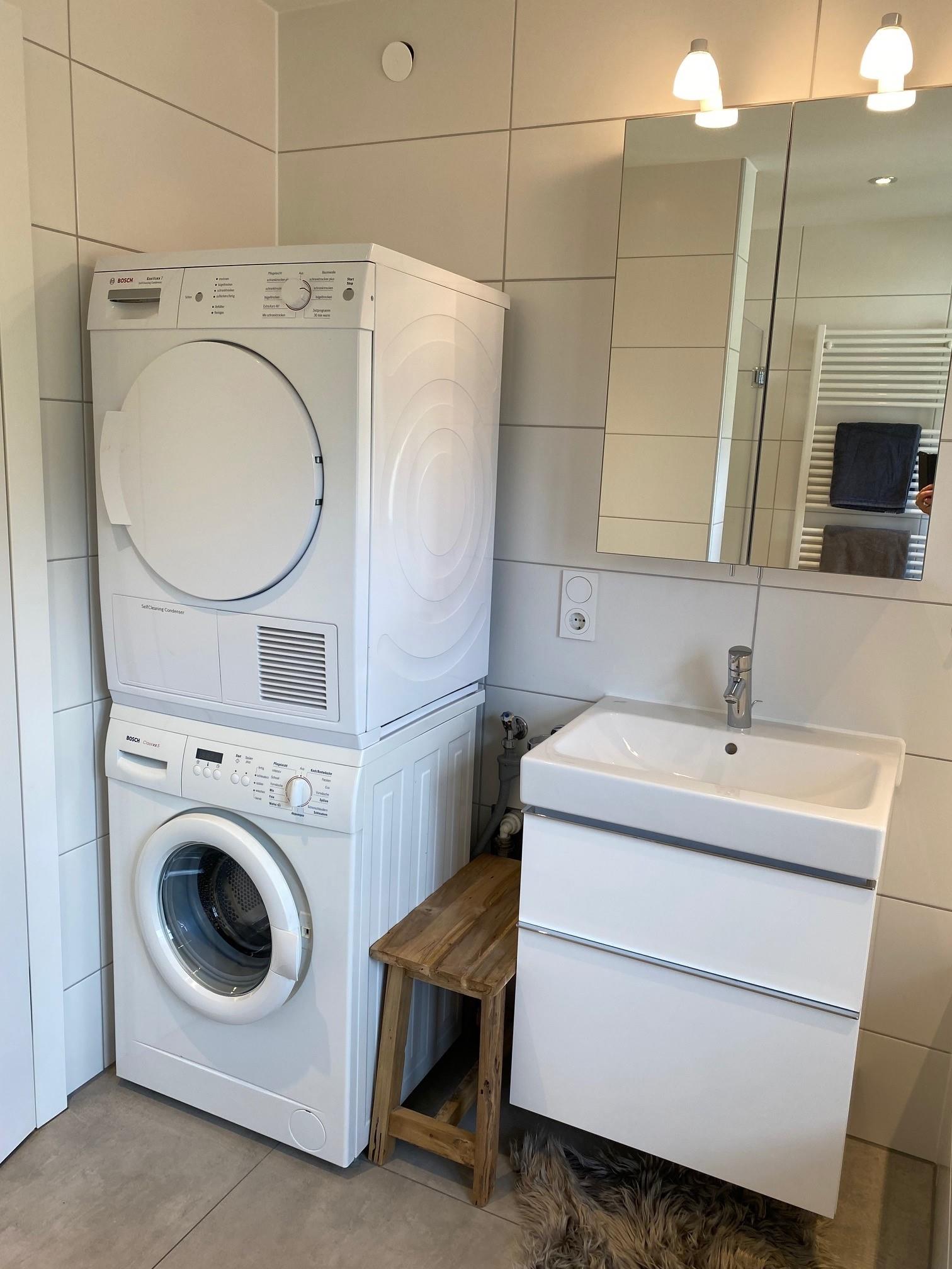 Bad mit Dusche (ohne Stufe), sep. Badewanne, WC, Waschmaschine und Trockner, Fenster.