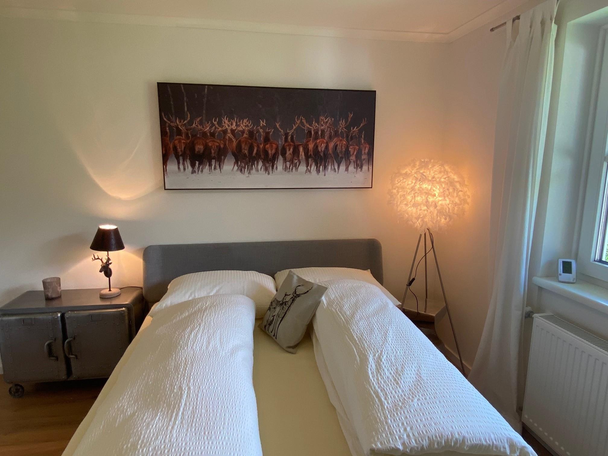 Schlafzimmer mit Doppelbett. Wohnzimmer mit hochwertiger und sehr komfortabler Ausziehcouch für 2-3 Personen, großer SAT TV, befülltes Bücherregal mit Wanderführern, Belletristik ect., Spiele