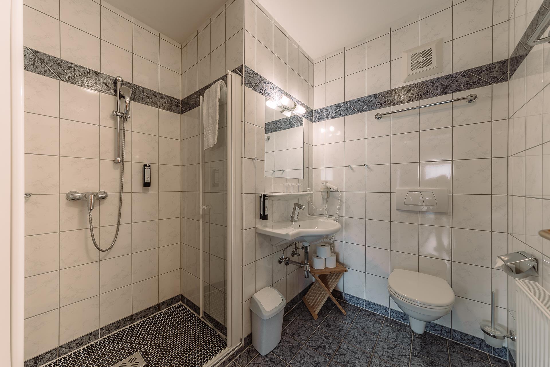 Badezimmer mit Dusche/WC/Haartrockner