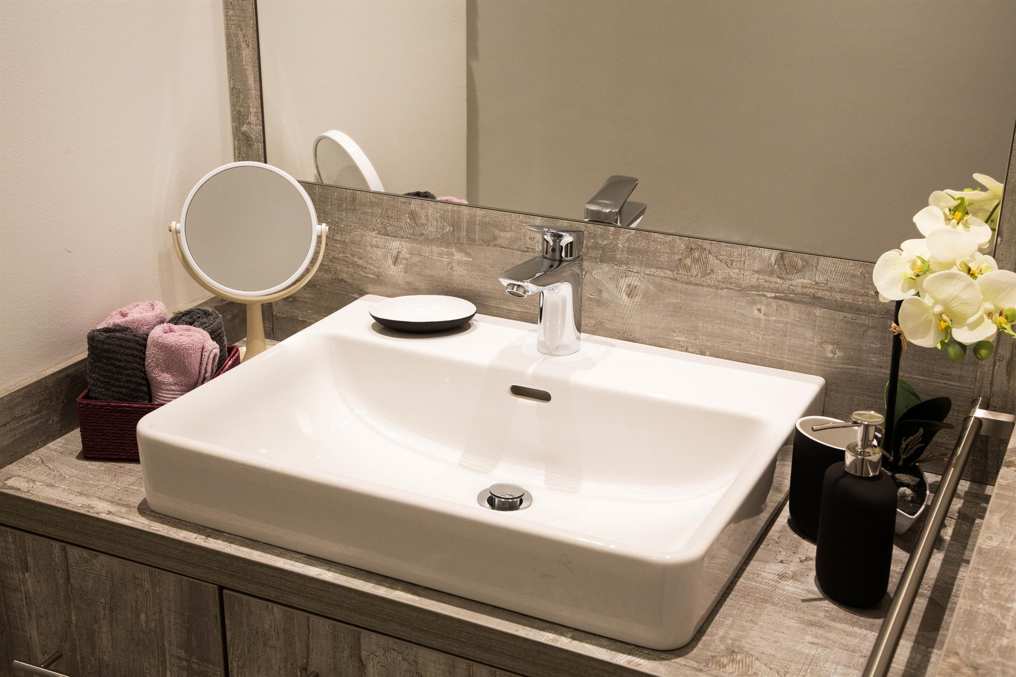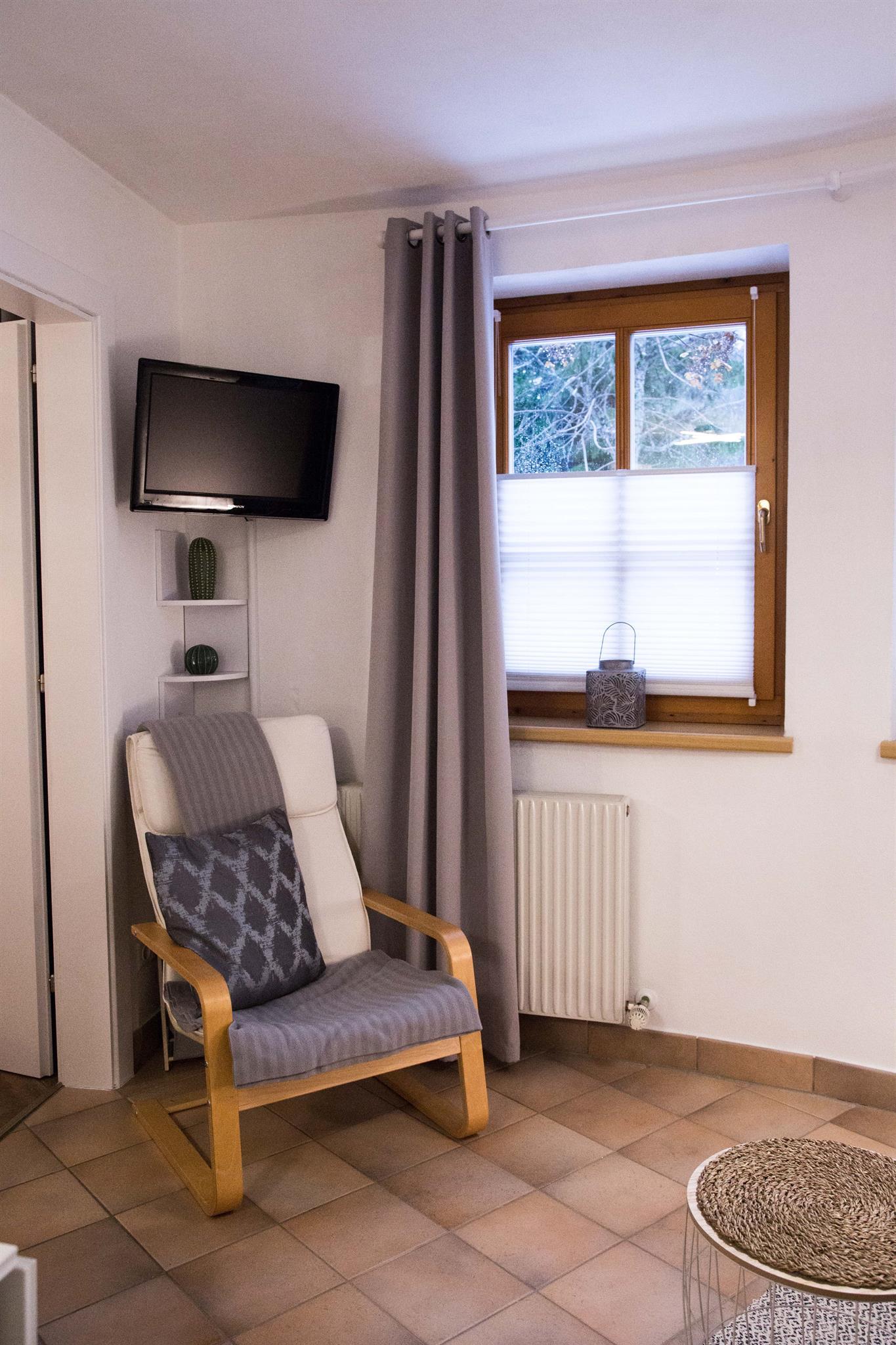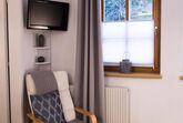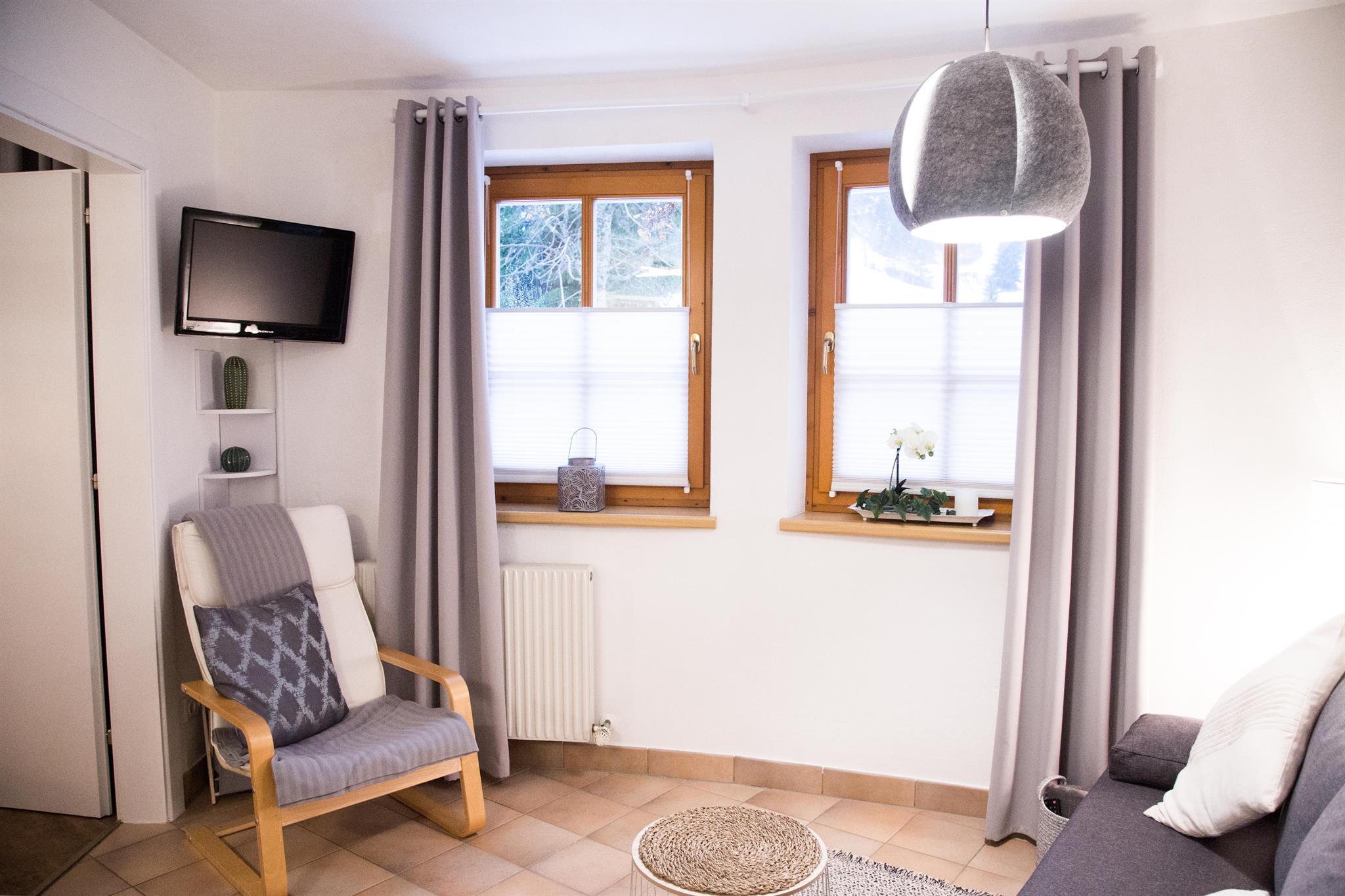 Ferienappartement in Top Lage im Herzen von Dienten für 2 Personen, Schlafzimmer mit Boxspringbett, Wohnraum/ Küche, elegantes Bad mit Regenwasserdusche, WC, Haarfön.