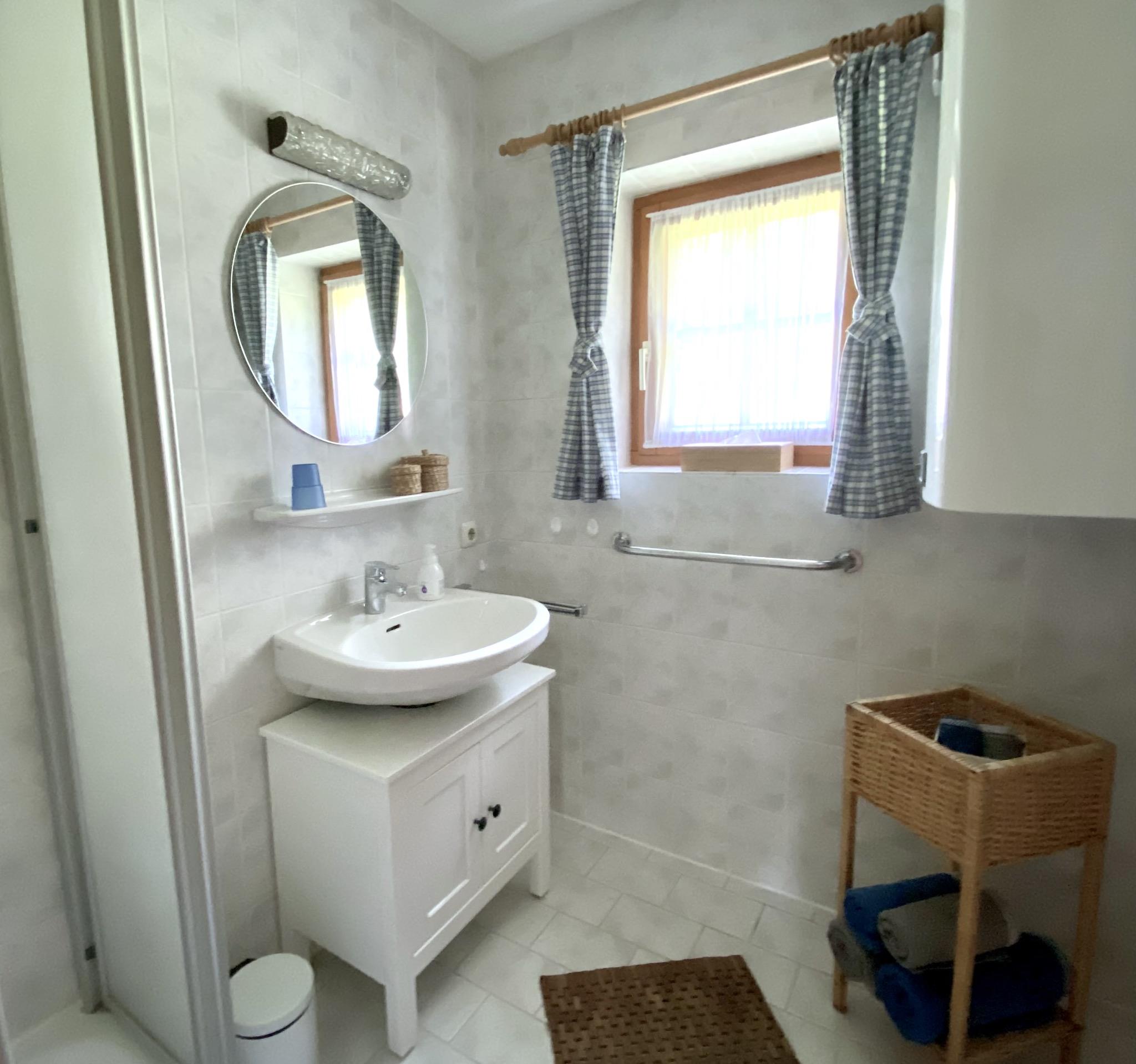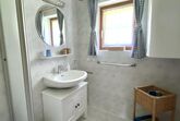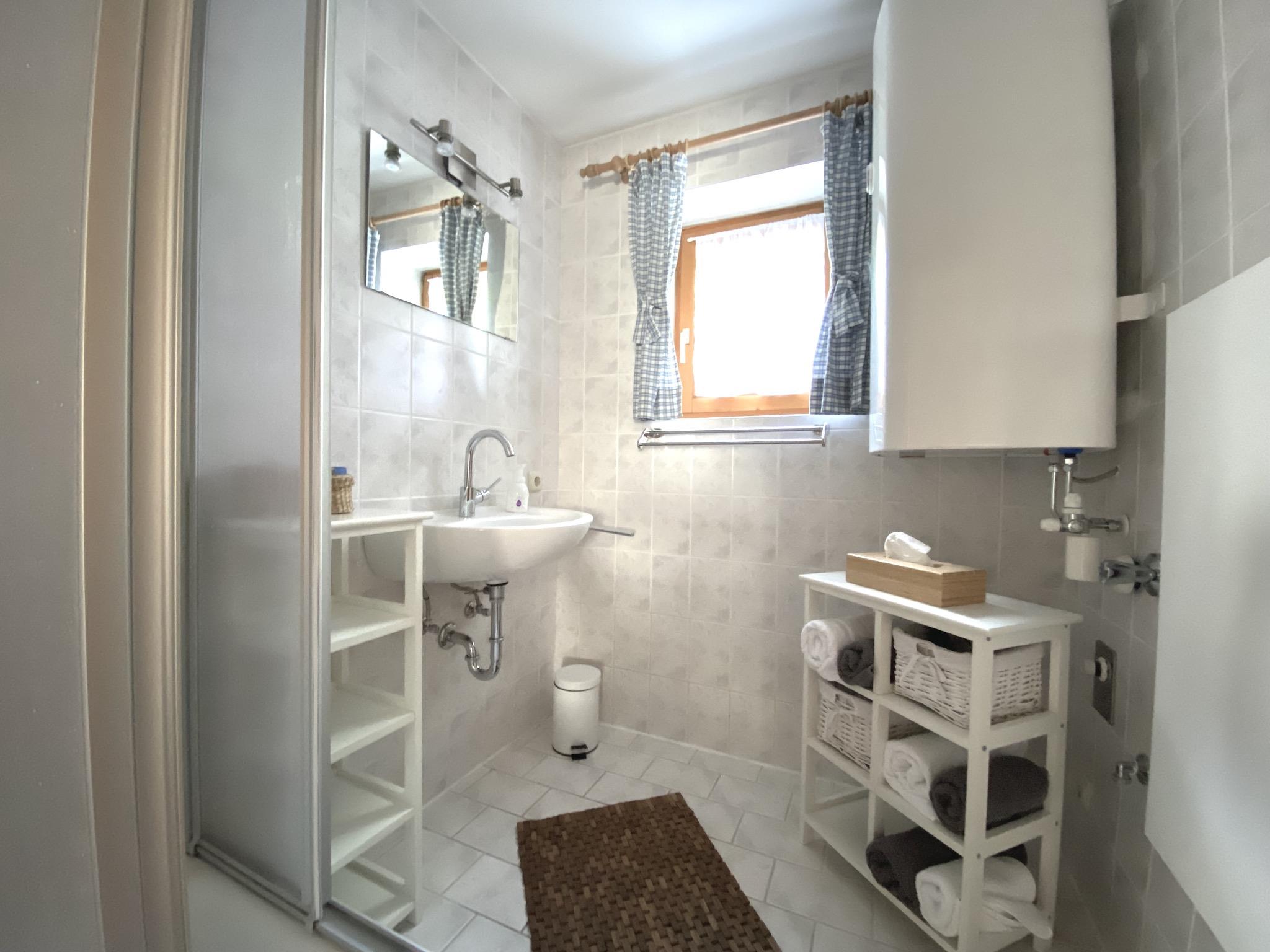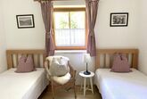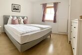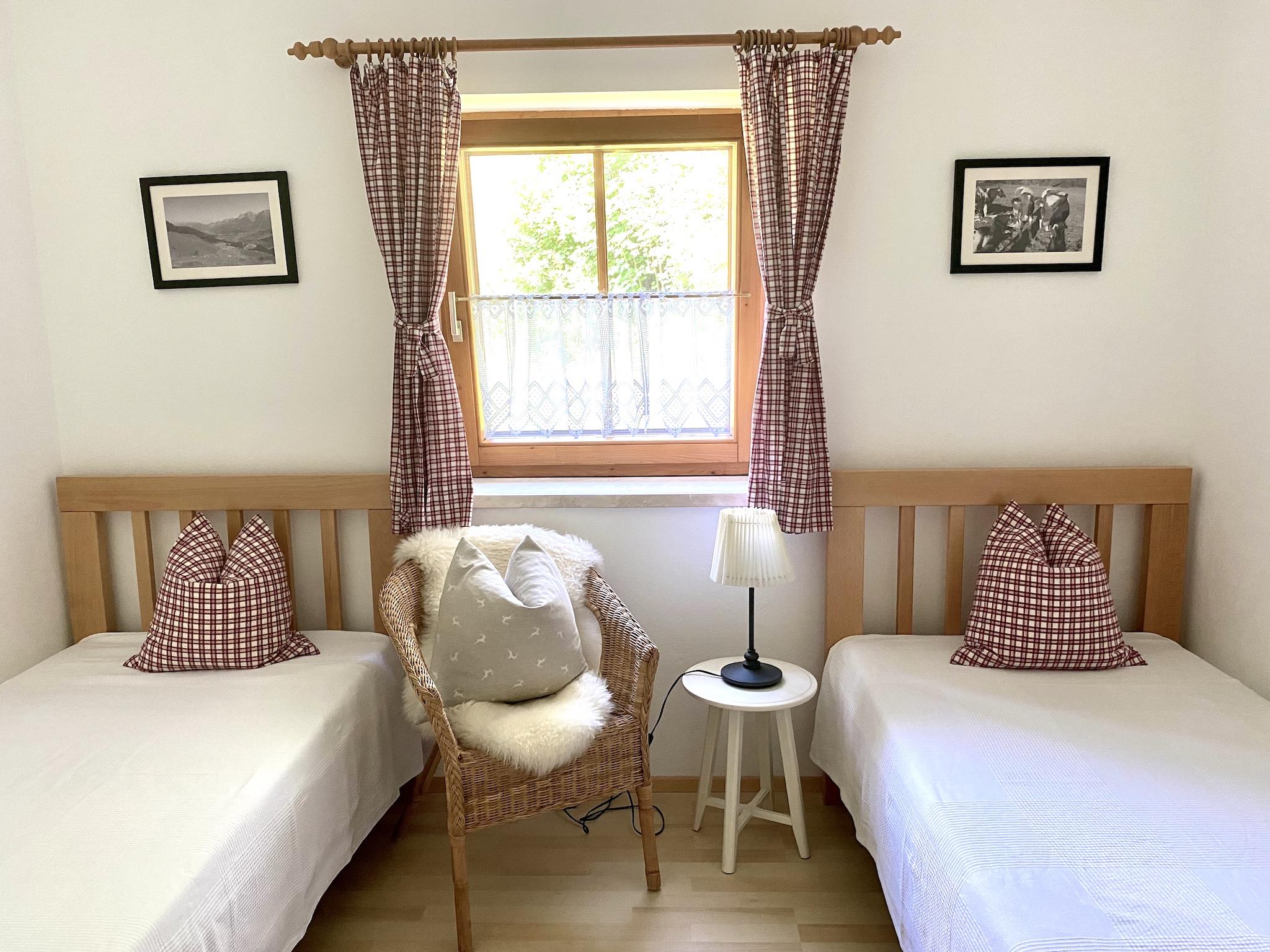 Zwei Schlafzimmer: Hauptschlafzimmer südseitig mit super komfortablen Boxspring Doppelbett, zweites Schlafzimmer mit Blick auf die Leoganger Steinberge und zwei Einzelbetten aus Vollholz mit Bio-Matratzen. Bad mit Dusche, getrenntes WC, kostenloses Wifi.