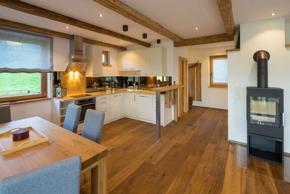 Alle drei Wohnungen sind mit seperatem Schlafzimmern, Wohnzimmer mit moderner Wohnküche, Nespresso Kaffeemaschine, Wasserkocher und Bar ausgestattet. Hinterleuchtete Altholzrückwände, Schwedenofen für gemütliche Stunden am Berg.