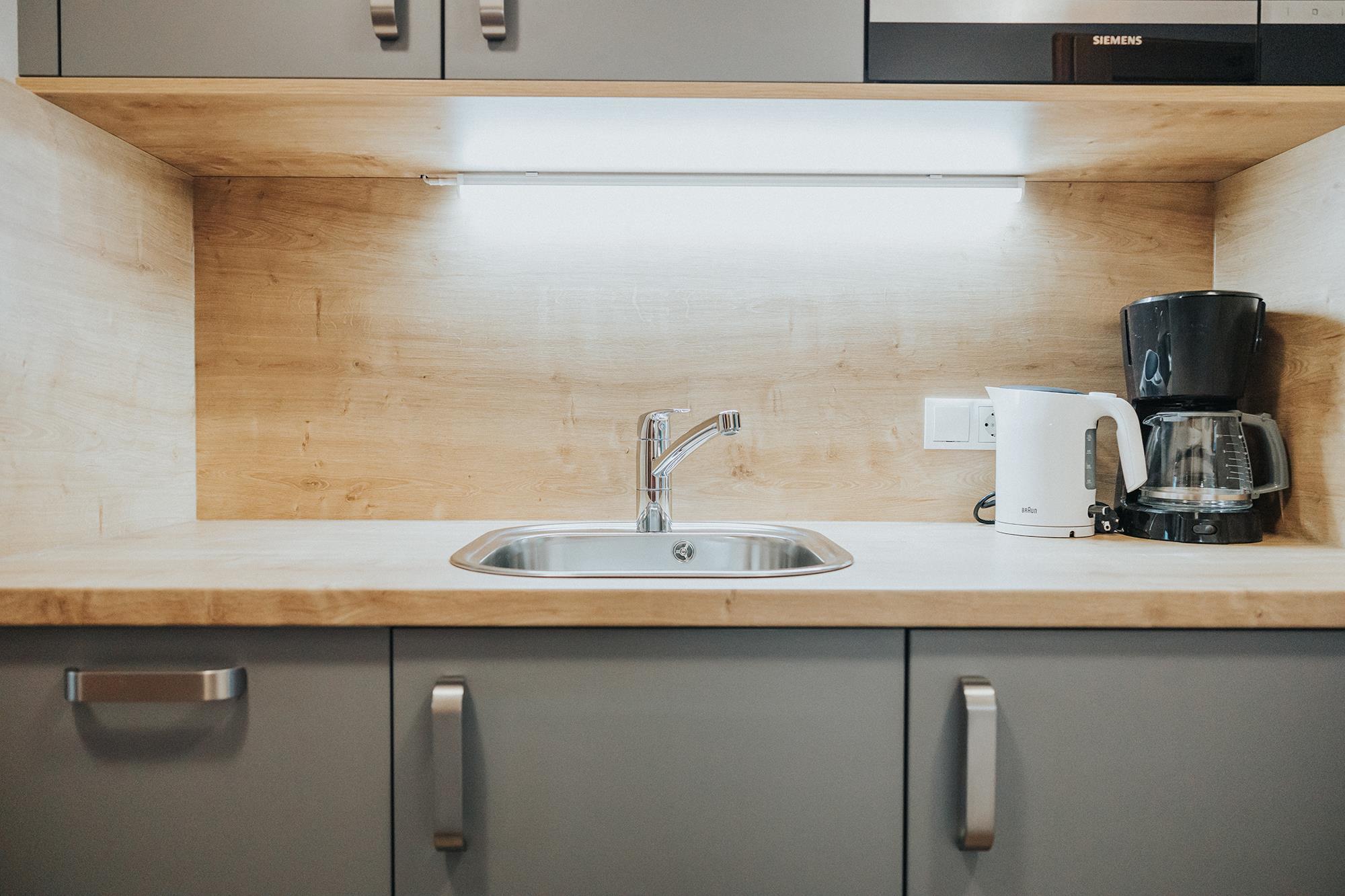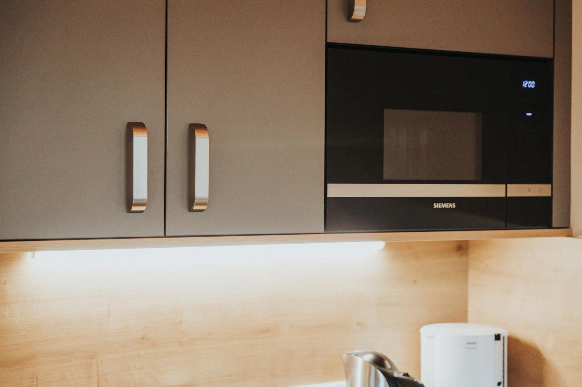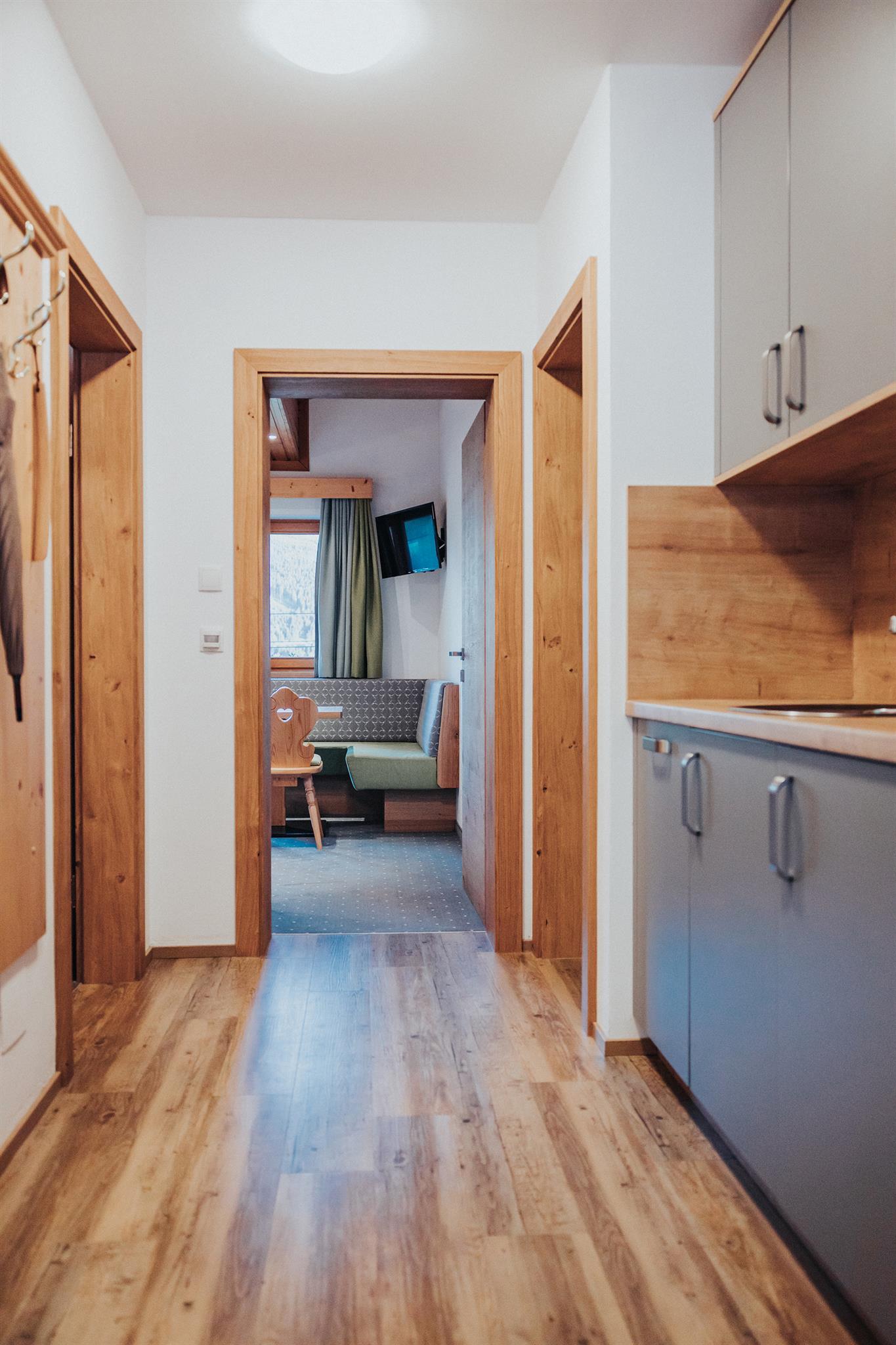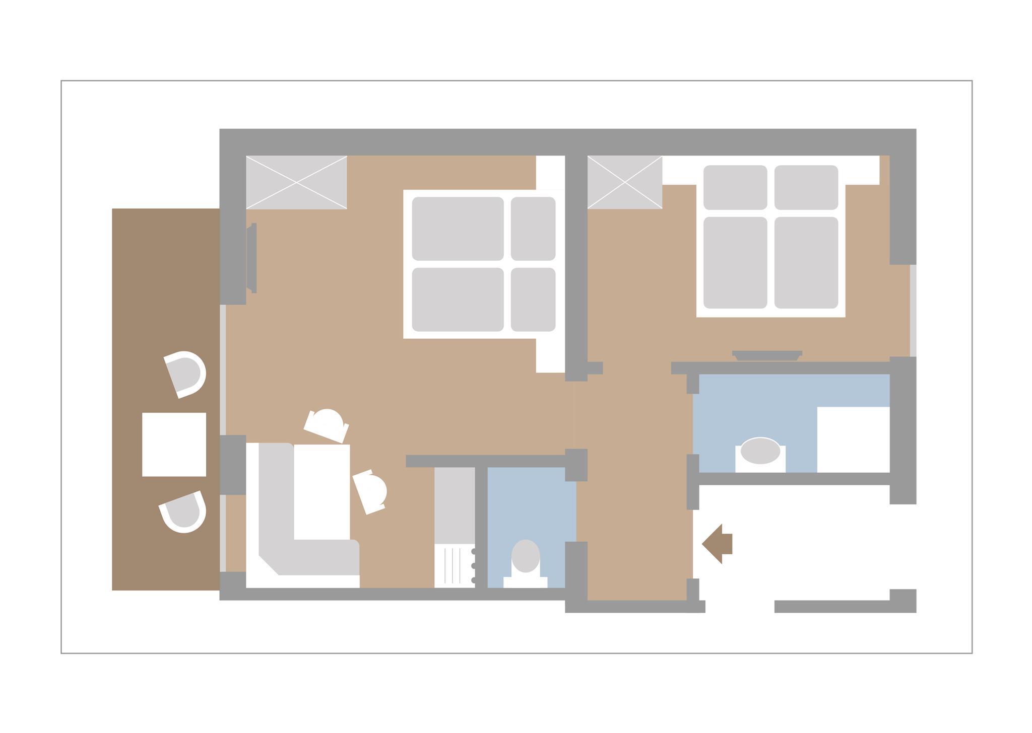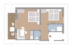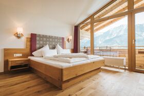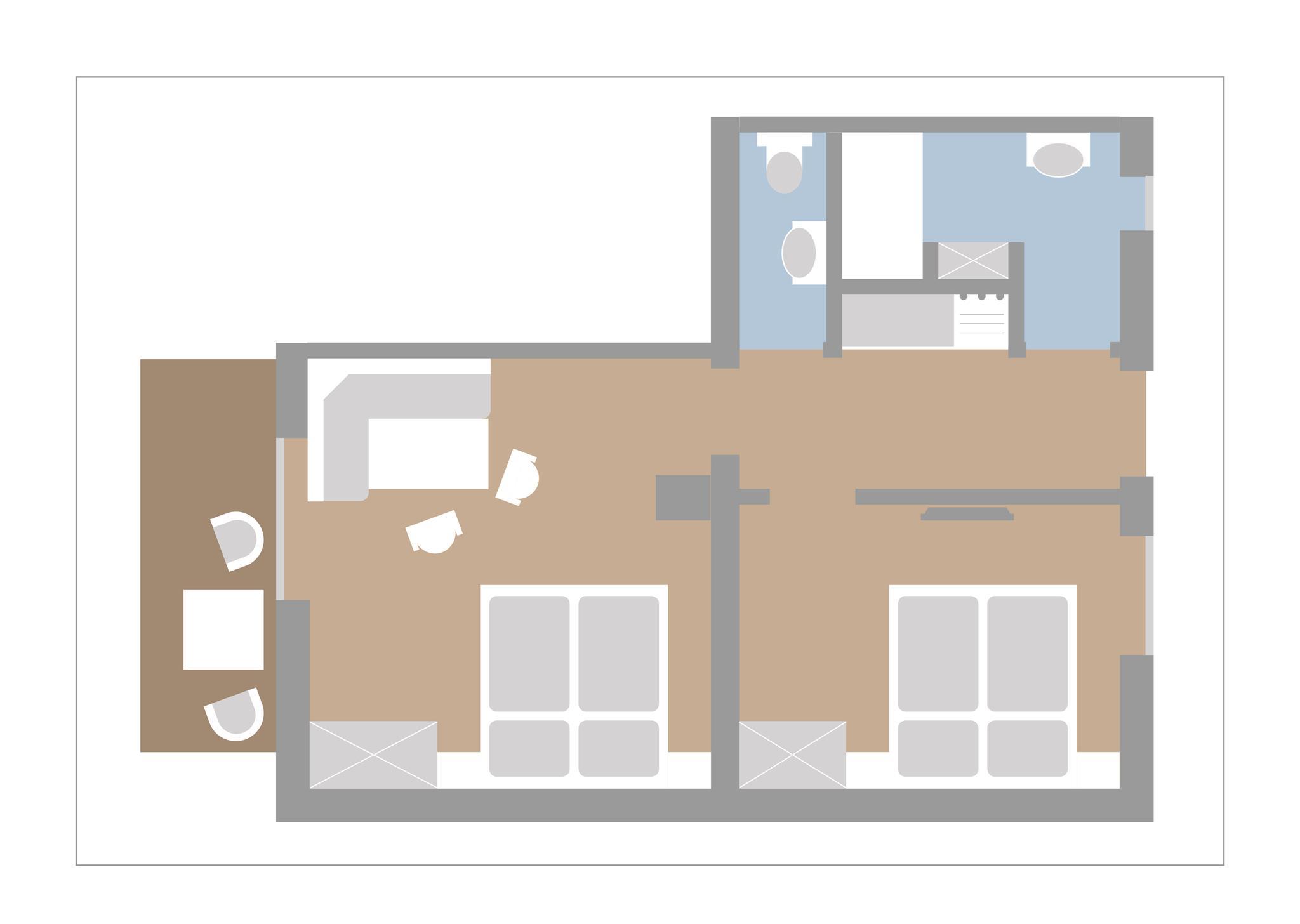 4-Personen-Familiensuite Heukareck - 40m² - 2 getrennte Schlafräume jeweils mit großem Doppelbett, Wohnraum mit kleiner Tee-Küche und gemütlichem Tisch mit Eckbank, Dusche/WC getrennt, Süd-Balkon und 2x32° Flat TV, Free-W-lan.