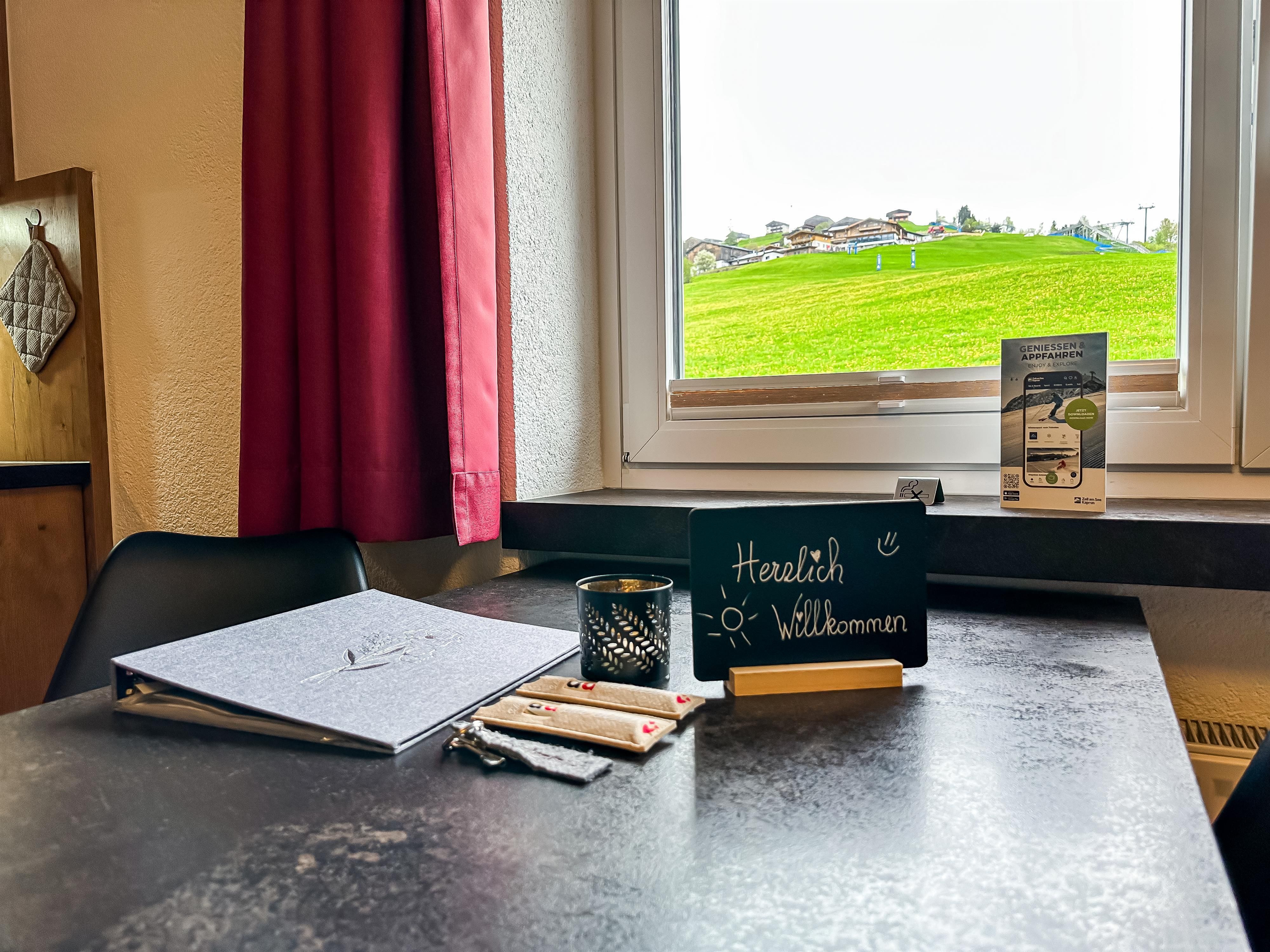 Zwar ohne Balkon, dafür mit einem traumhaften Ausblick direkt auf die Skipiste – dank großem Panoramafenster mit Blick ins Paradies direkt hinter dem Haus.