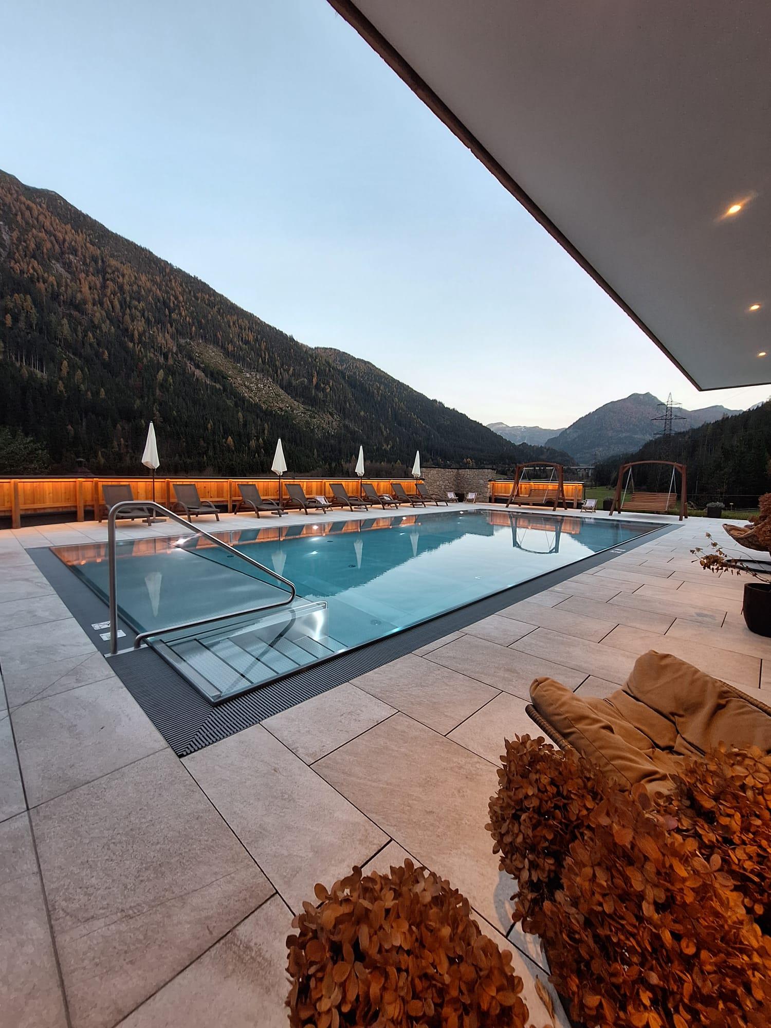 Wellness & Entspannung Unser neuer Wellnessbereich mit zwei Saunen, beheiztem Outdoor-Pool und einem Ruheraum lädt zum Relaxen ein.