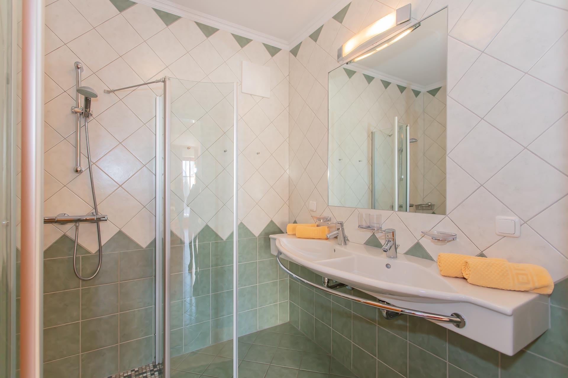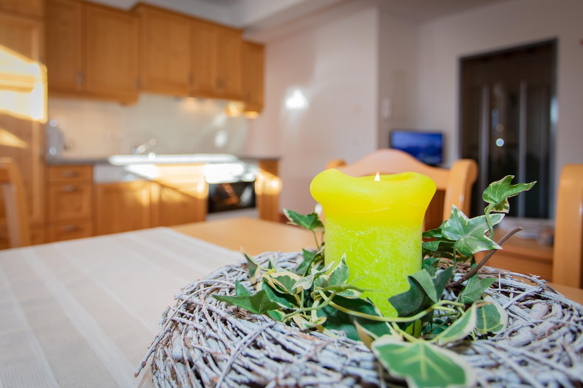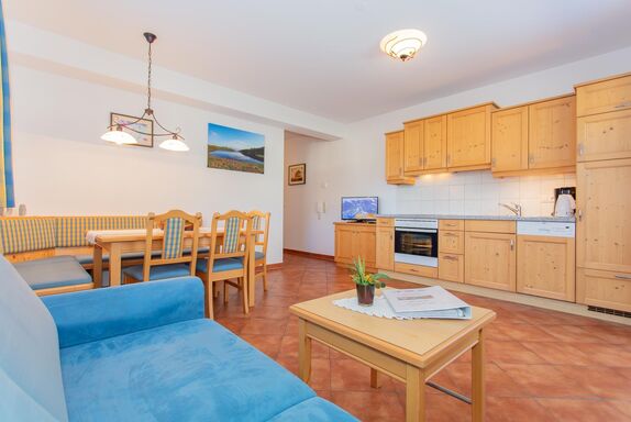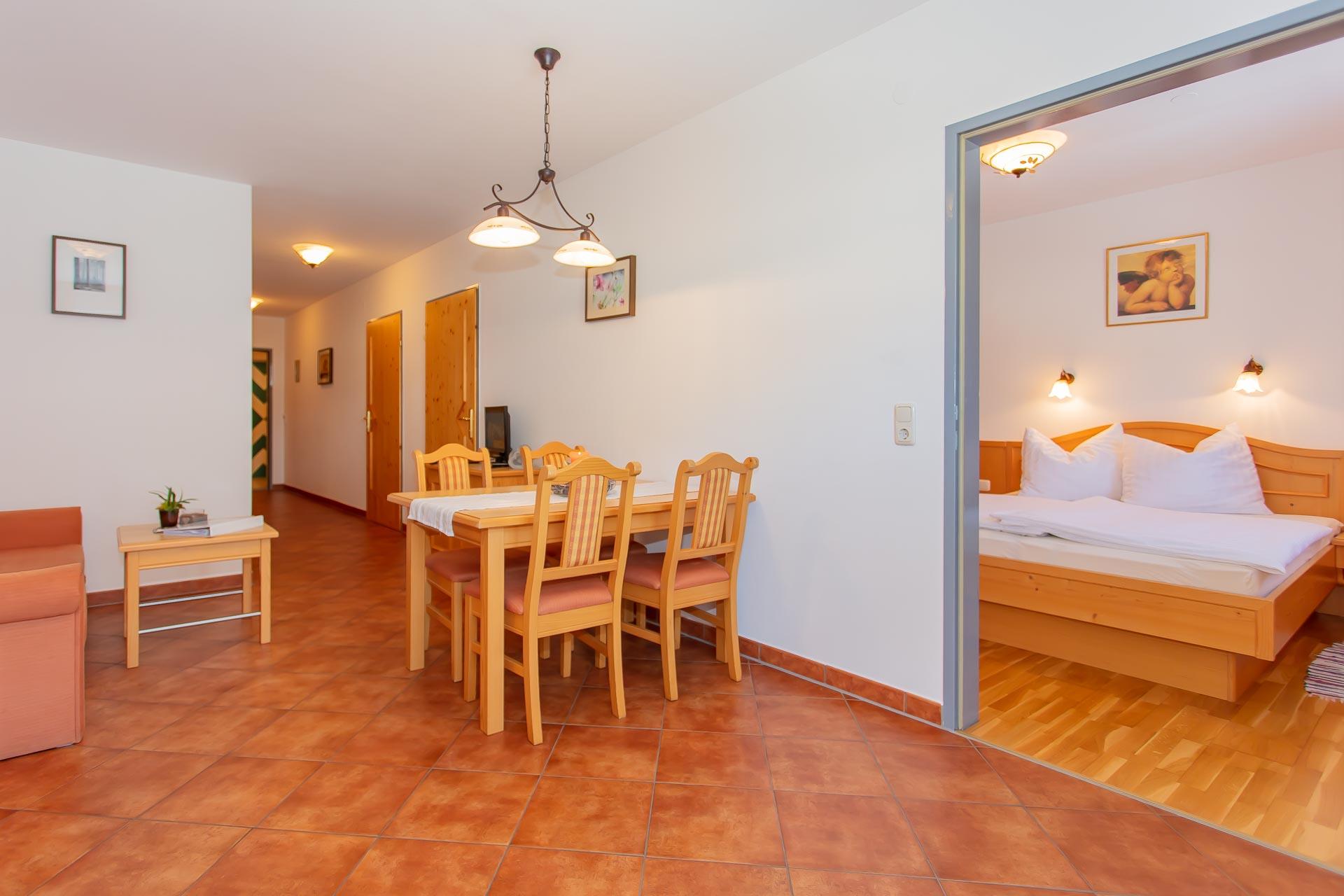 Ferienwohnung für 4 - 6 Personen, rollstuhlgerecht, Wohnküche mit Essbereich und Ausziehcouch, 2 getrennte Schlafzimmer (1x mit Doppelbett, 1x mit zwei getrennten Betten), DU und WC getrennt, Parterrewohnung mit Garten.