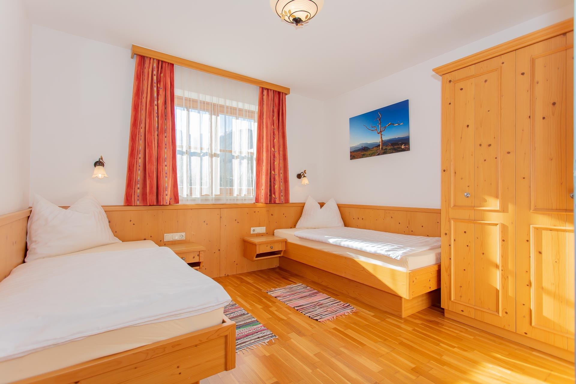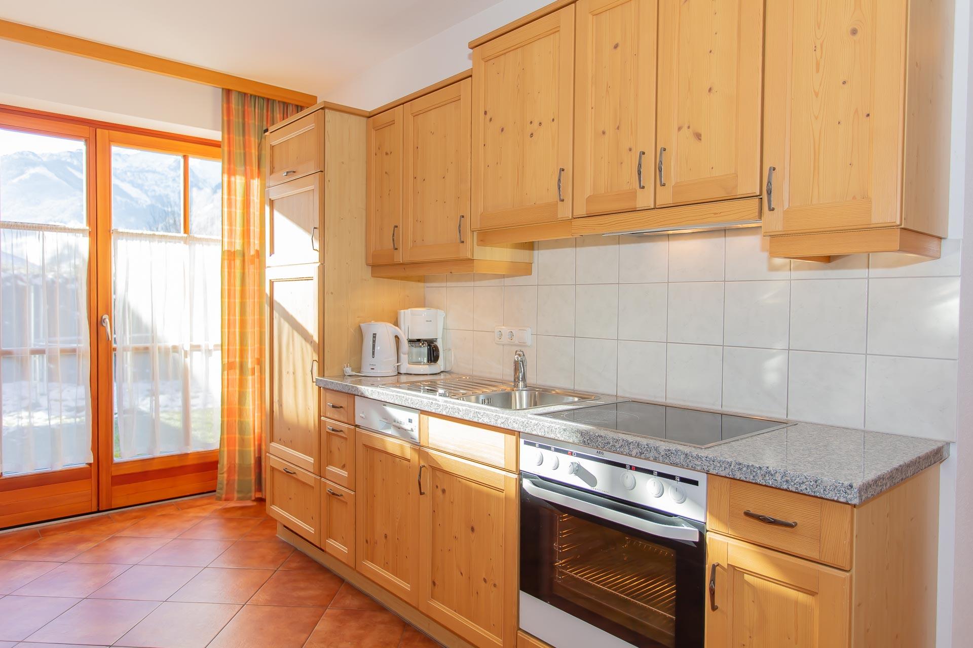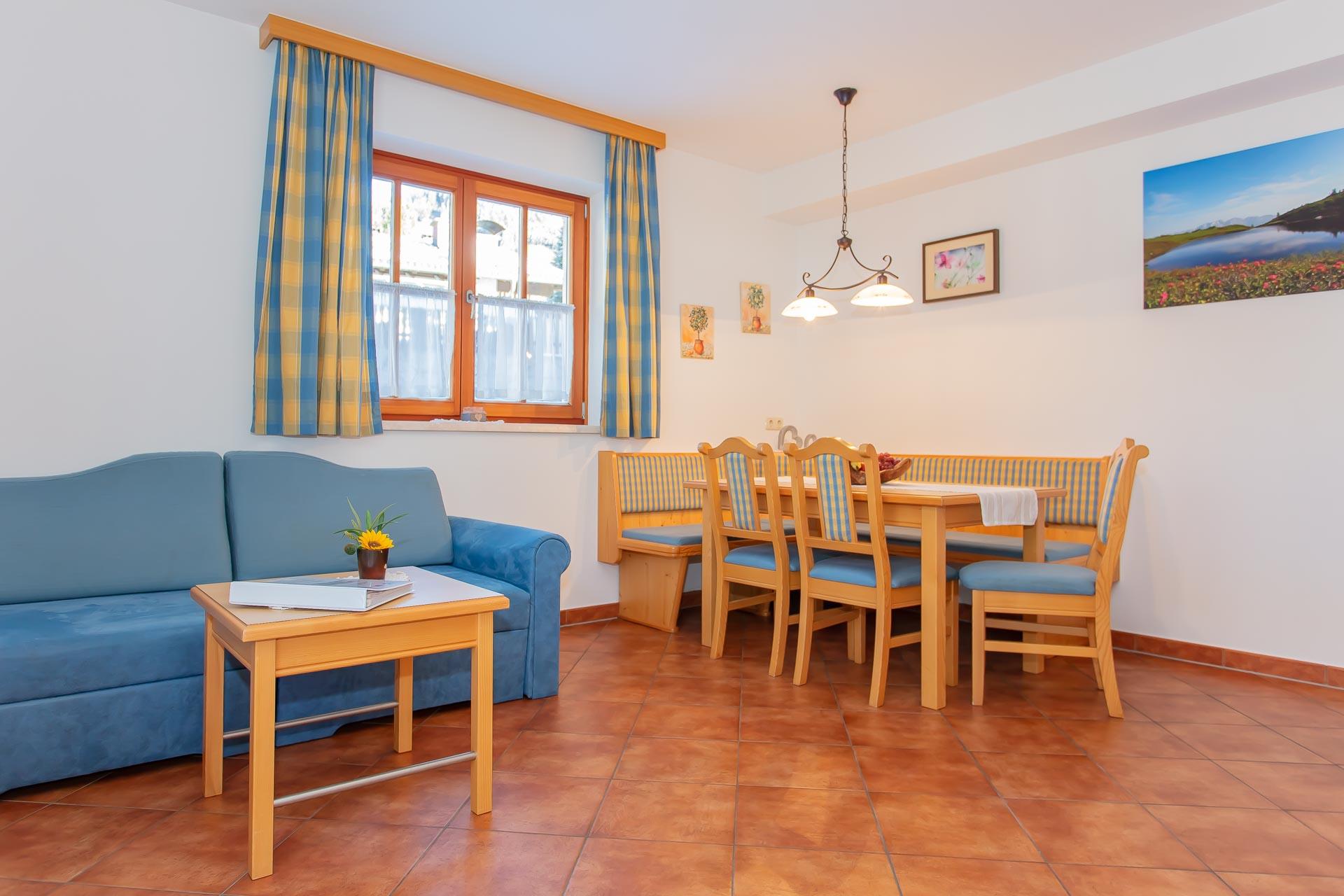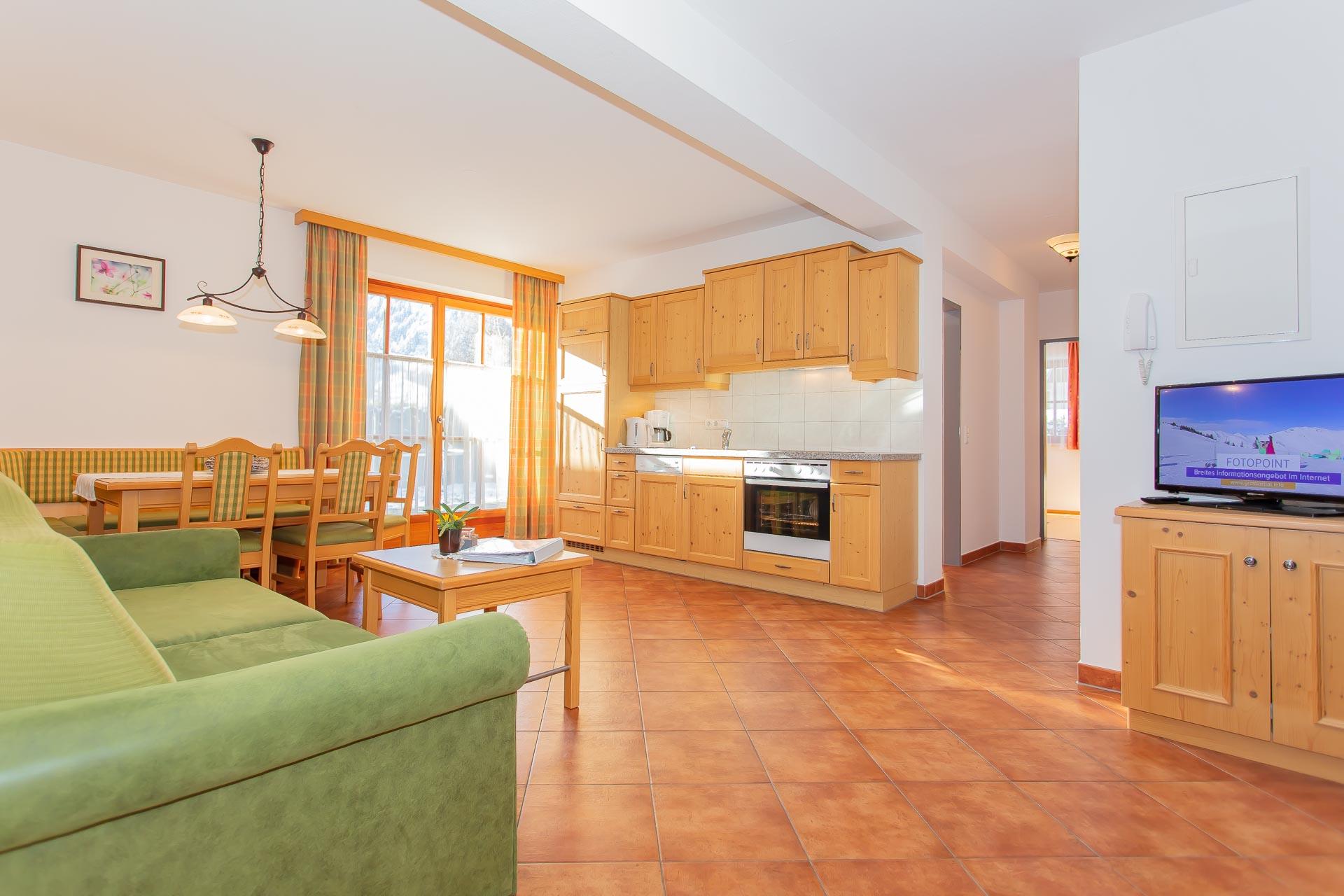 Wohnung Fichte - geeignet für 4 - 6 Personen, Wohnküche mit Essbereich und Ausziehcouch, 2 getrennte Schlafzimmer (1x mit Doppelbett und 1x mit zwei getrennten Betten), DU und WC getrennt, Parterrewohnung mit Garten.