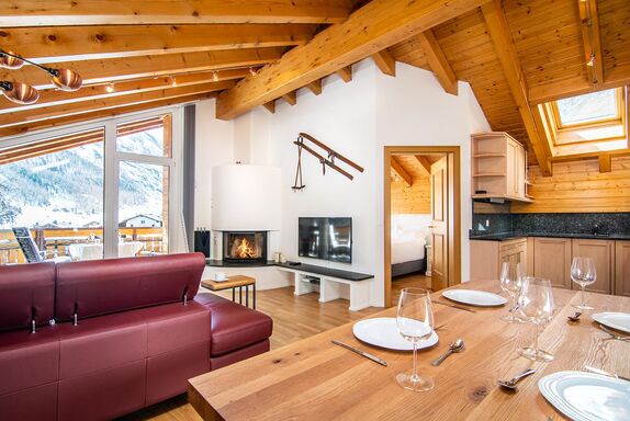 Die Wohnung befindet sich im Dachgeschoss und besteht aus 3 Schlafzimmern (alle Betten 180cm breit) und 2 Bädern (1x Ensuite mit Badewanne/WC, 1x mit Badewanne/WC). Die offene Küche ist mit allen Utensilien ausgestattet, einschließlich einer Nespresso-Maschine. Die Gäste profitieren ausserdem von einem Smart TV und kostenlosem Wifi. Die Highlights der Wohnung sind sicherlich der gemütliche Kamin und die tolle Aussicht vom Balkon.