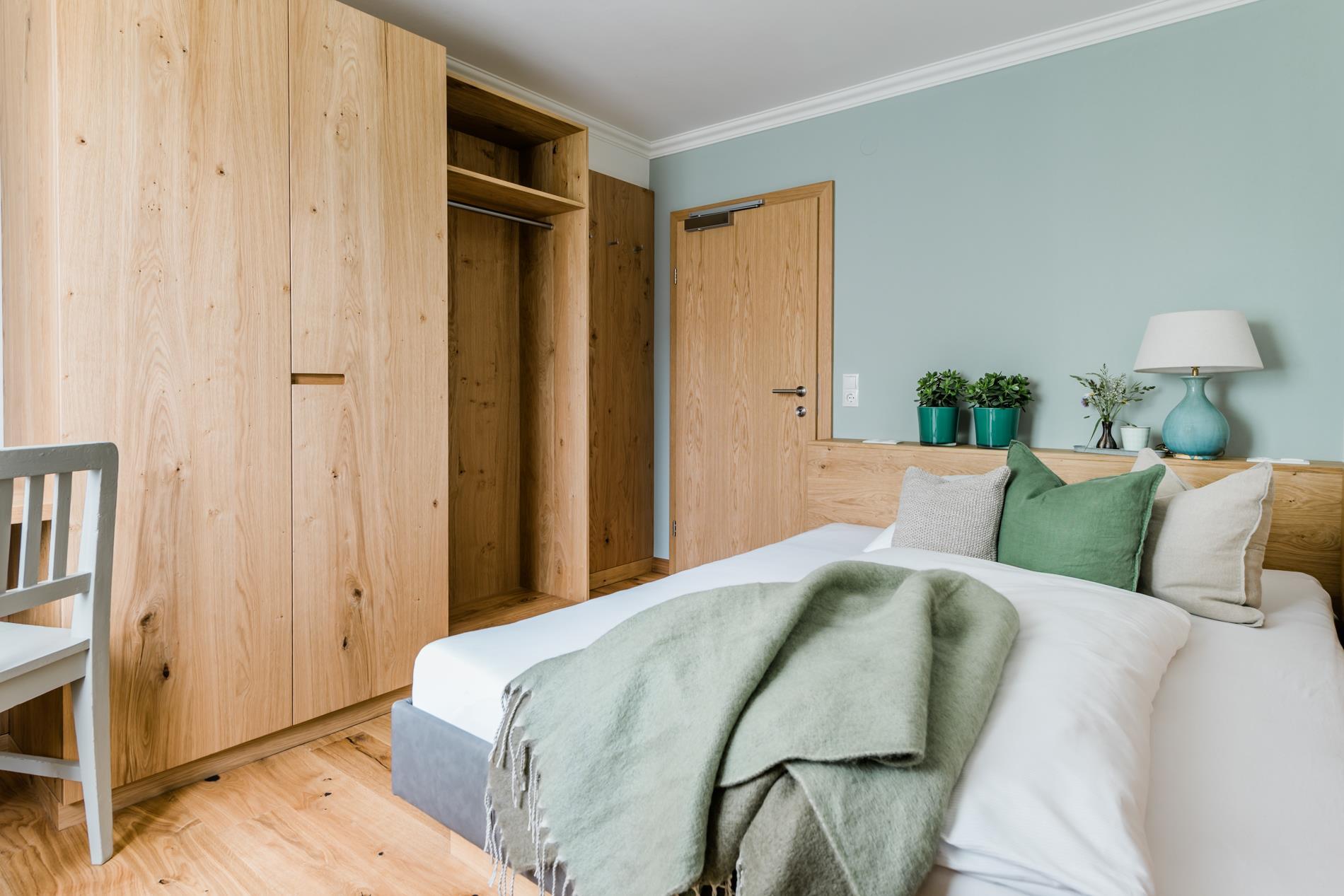 In dem rund 13 Quadratmeter großen Einzelzimmern mit extra großem Französischen Bett (1,60 m Bettbreite) können Sie so richtig entspannen und ausschlafen. Wer es besonders kuschelig mag, kann sich das Zimmer natürlich auch teilen.