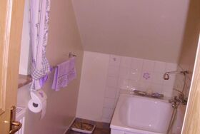 Dusche und WC zur alleinigen Nutzung dieses Zimmer am Flur. Außerdem steht meinen Gästen ein Aufenthaltsraum mit Kühlschrank, Mikrowelle, Geschirrspüler und Herdplatte zur Verfügung.