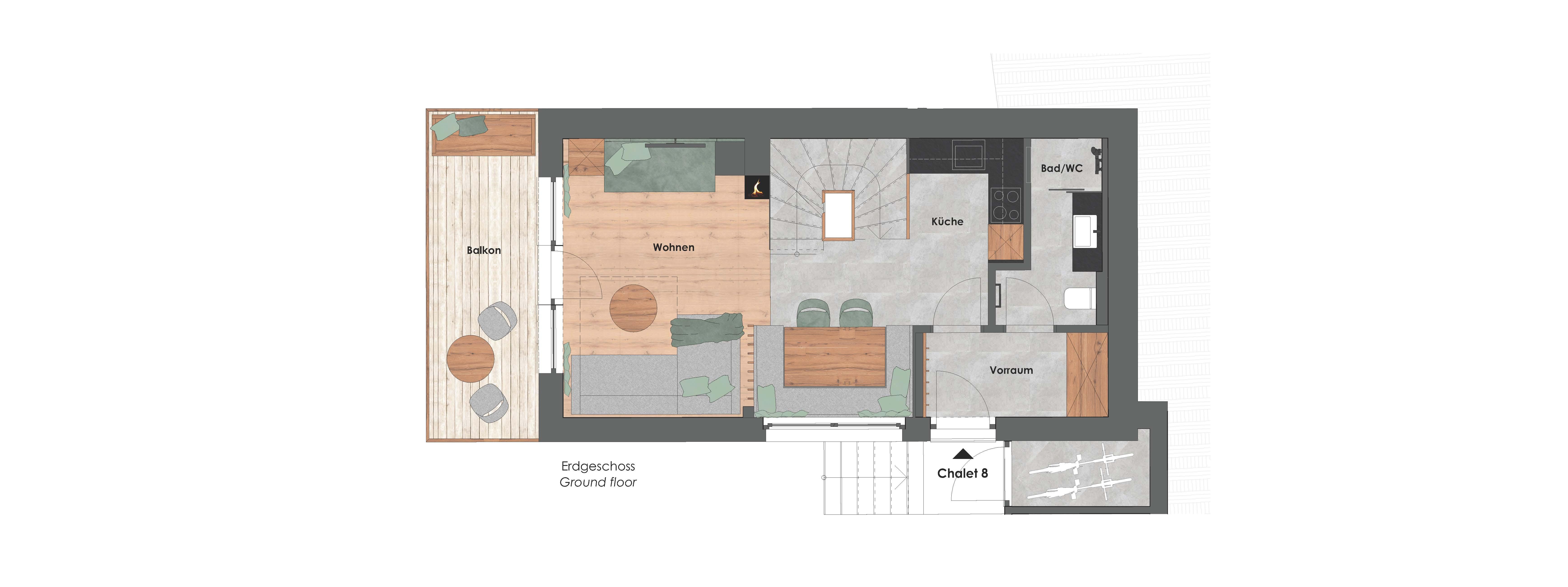 Die dreistöckigen Berg Spa Chalets bietet im Erdgeschoss  eine vollausgestattete Küche, vom heimischen Tischler gefertigt mit Backofen samt Mikrowellenfunktion, Geschirrspüler, Induktionsherdplatten und Kühlschrank mit Tiefkühlfach sowie Kaffeemaschine und Wasserkocher. Der große Holz-Esstisch für gemeinsame Mahlzeiten grenz direkt an den Wohnbereich mit gemütlichem Kamin, Sofa ( auch als zusätzlicher Schlafplatz für 2 nutzbar) und einem Diwan (bequeme Liege) sowie  ein Badezimmer mit Dusche &  WC .