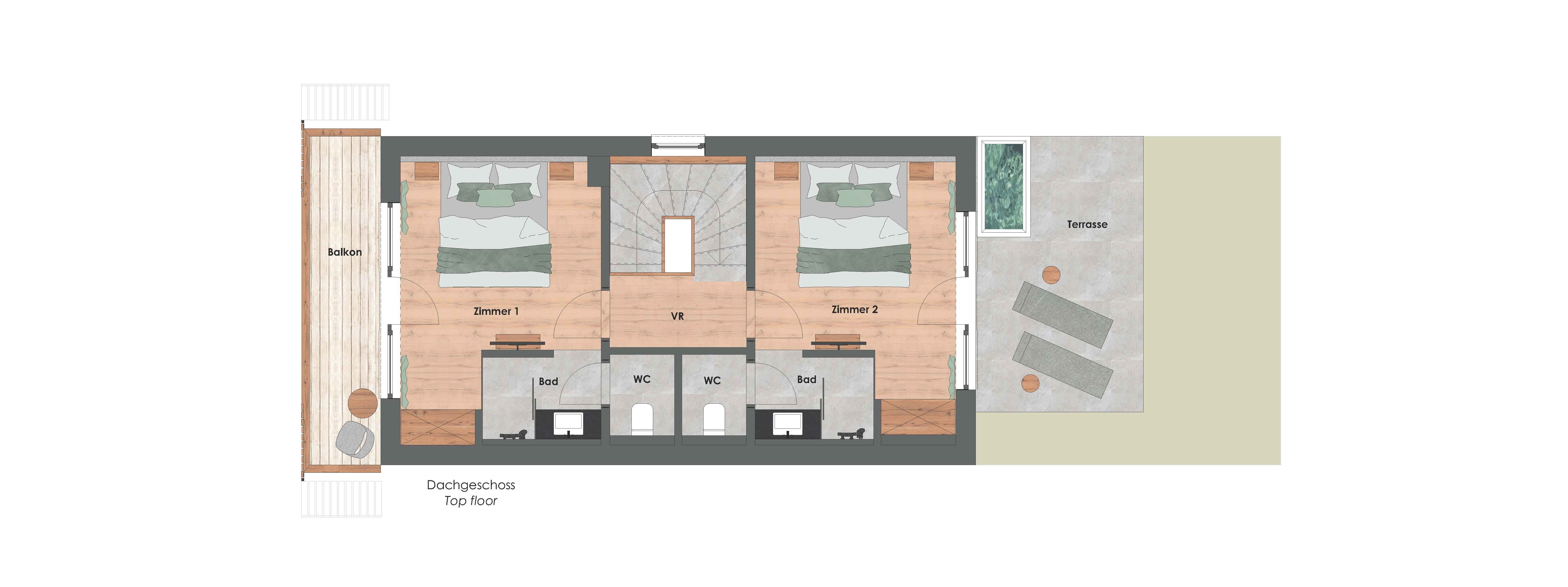 Im OG  finden Sie 2 Schlafzimmer, je mit Dusche/WC.  eins mit Balkon, das andere mit Terrasse inkl. Außenbadewanne.