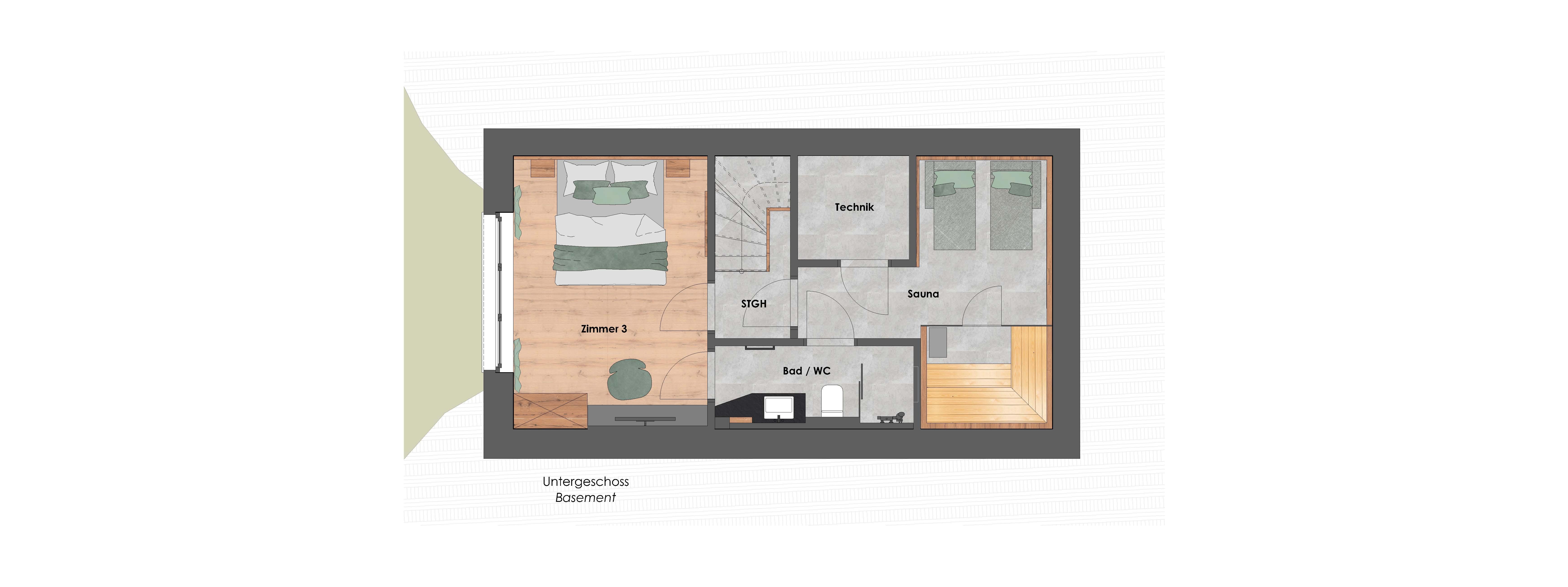 Im UG befindet sich das 3.Schlafzimmer mit Tageslicht und Dusche/WC sowie eine edle Sauna mit Liegen zum Entspannen.