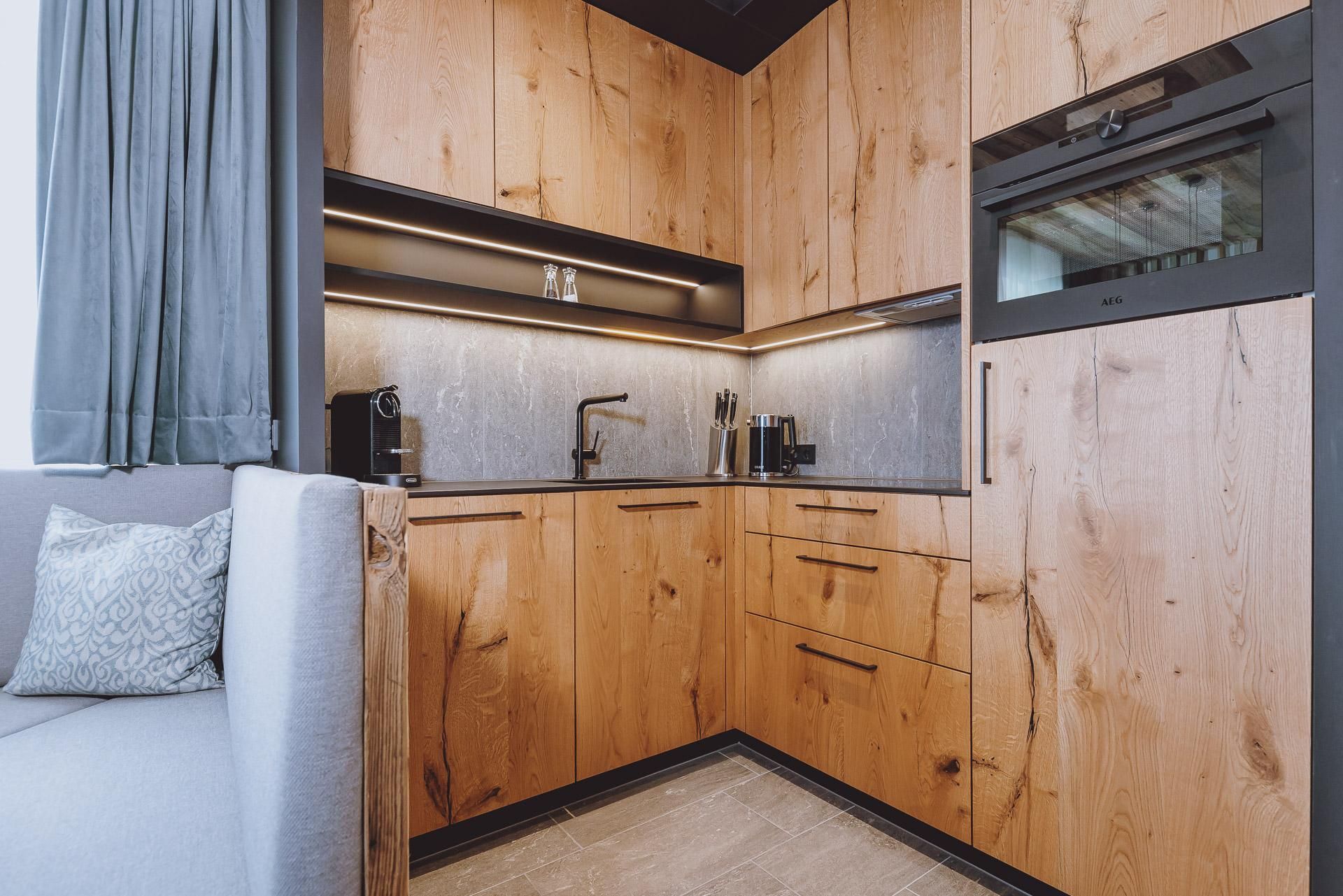 Die eleganten 1-Raum Suiten Berg befinden sich im Gutshof vom Zaglgut und sind mit edlen Eichenholzmöbel und hochwertigem Polsterbett sowie bequemen (Auszieh-)Sofa Liegefläche 150 x 195 cm) ausgestattet.