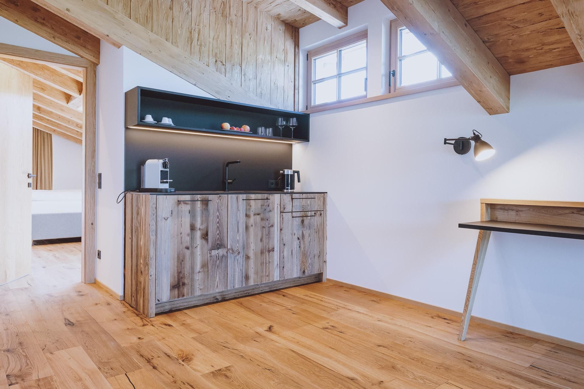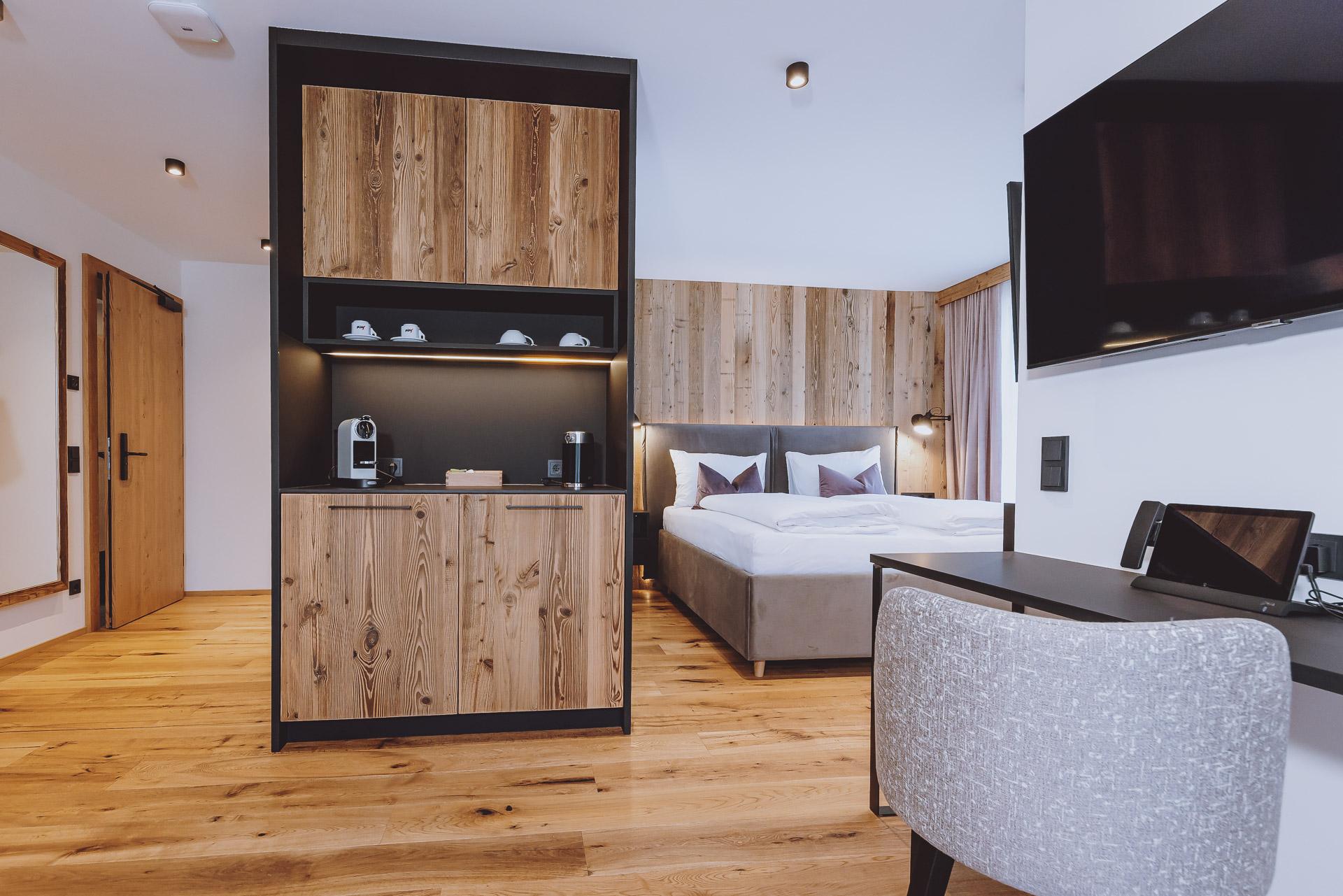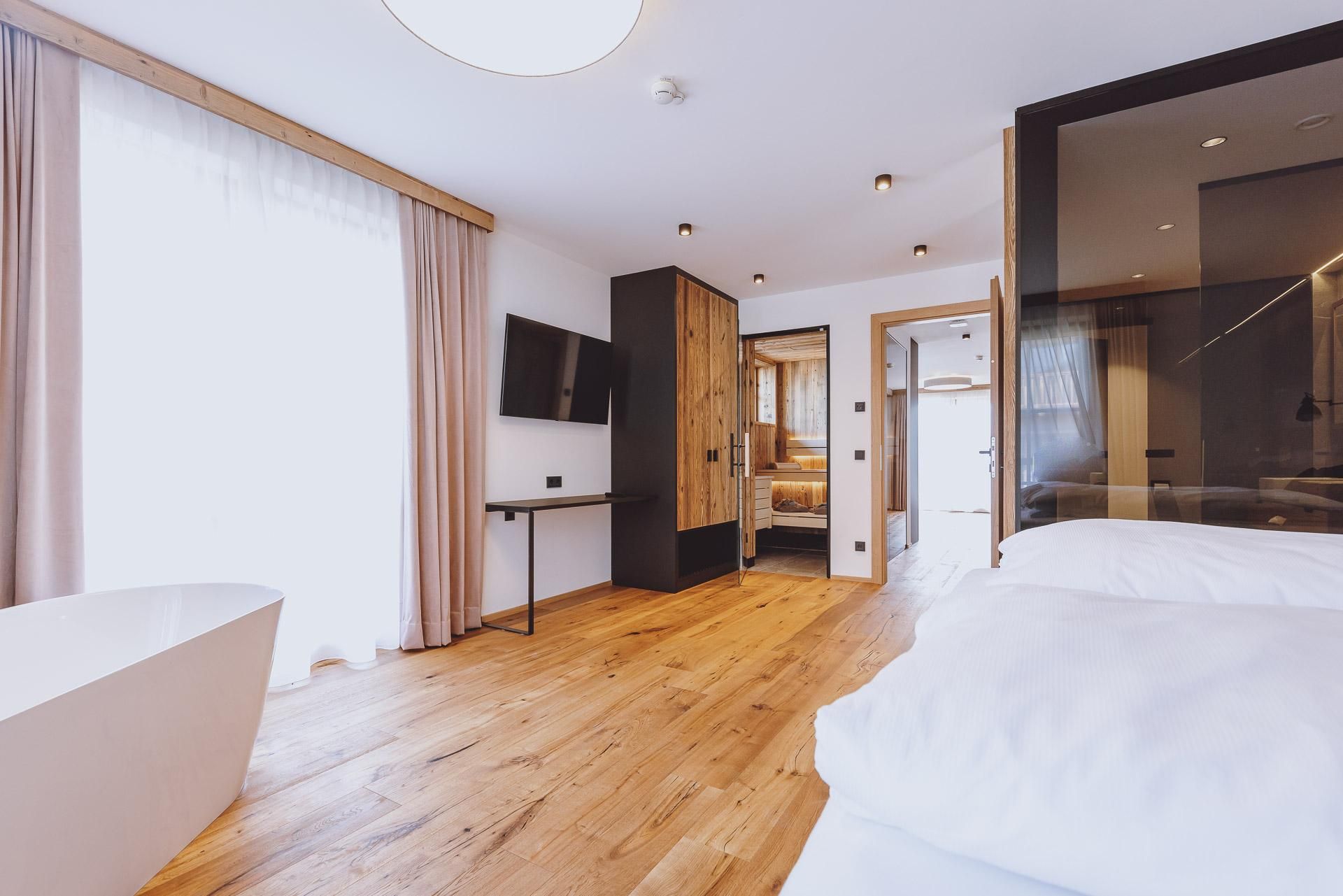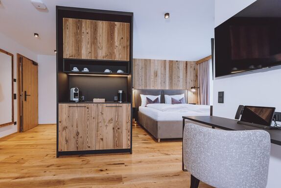 Die Ein-Raum Suiten und befinden sich im Gutshof vom Bergdorf Hotel Zaglgut. Die Juniorsuite See ist mit hochwertigen Eichenholzmöbel, kuscheligem Polsterbett und gemütlichem (Auszieh-)Sofa ausgestattet. Bei den Juniorsuiten See im zweiten Stock sorgen eine freistehende Badewanne und eine Dachschräge für Charme (keine Badwanne im ersten Stock!). Das offene Badezimmer mit Dusche ist räumlich vom WC getrennt. Ein Schreibtisch, TV-Flatscreen, eine Teeküche mit Wasserkocher, Kaffeemaschine, Kühlschrank, Safe sowie ultraschnelles Glasfaser W-LAN runden das Angebot ab. Der Ausblick von Ihrem Sonnenbalkon reicht bis zum Zeller See.
