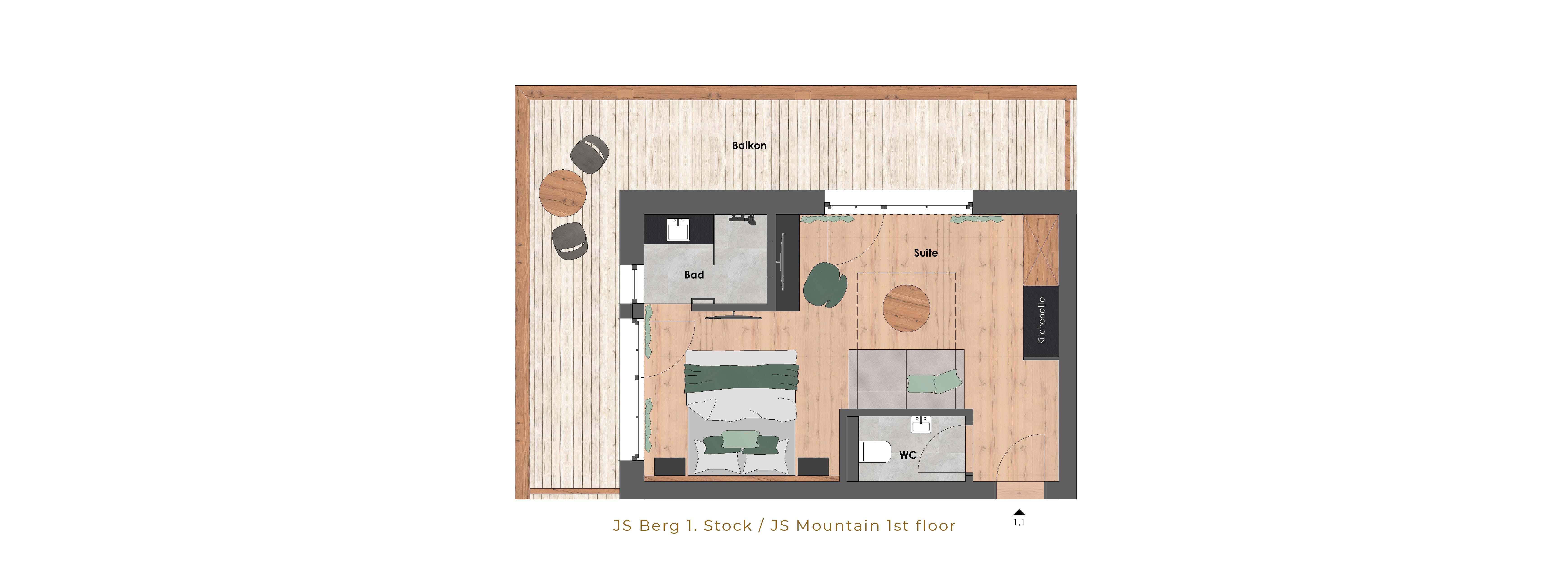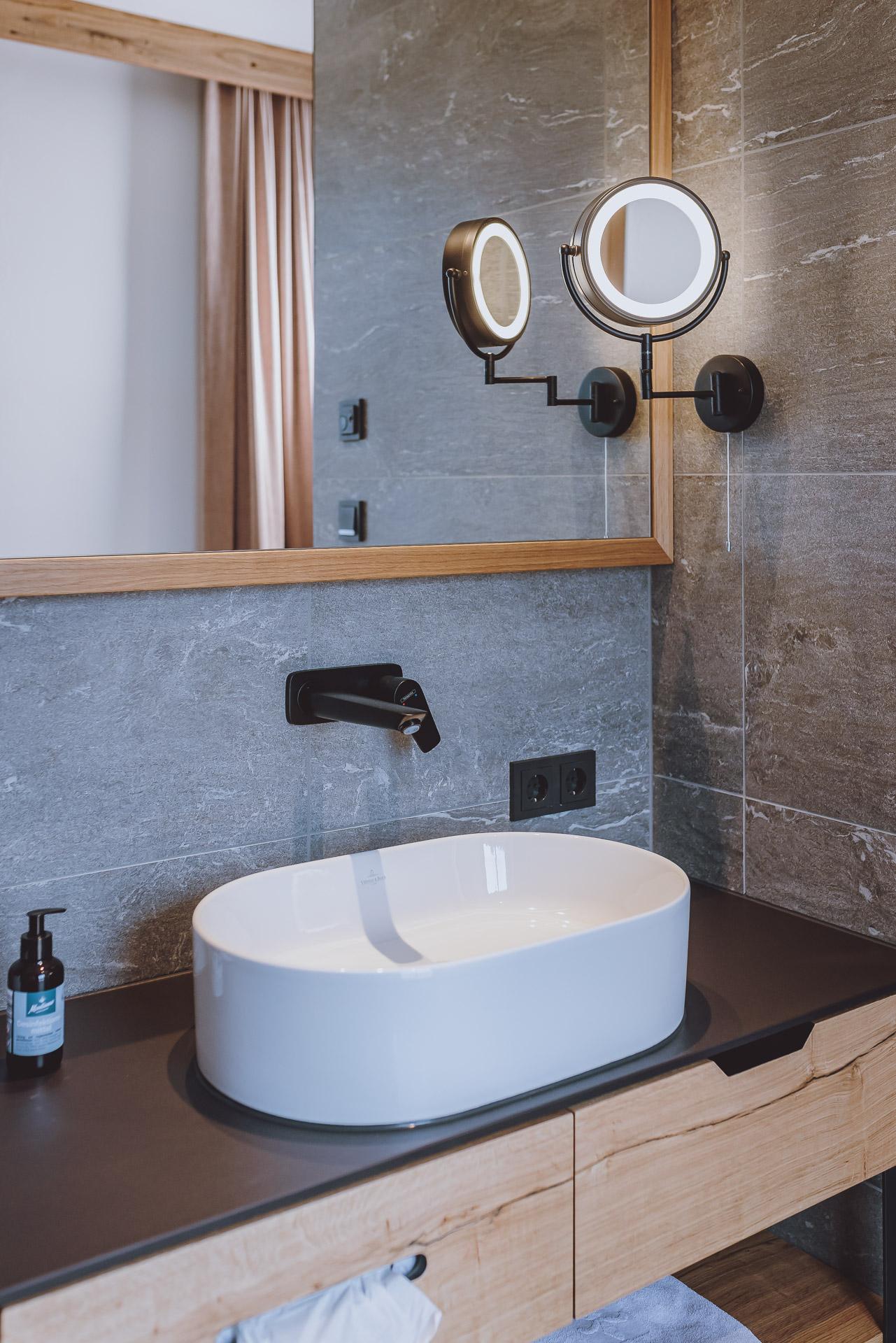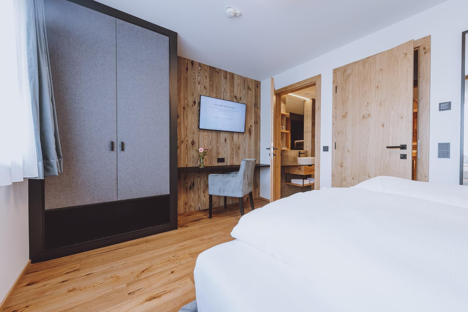 Die Juniorsuite See kann auf Anfrage mit der Juniorsuite Berg zu einer großen 65 m² Suite verbunden werden.