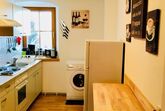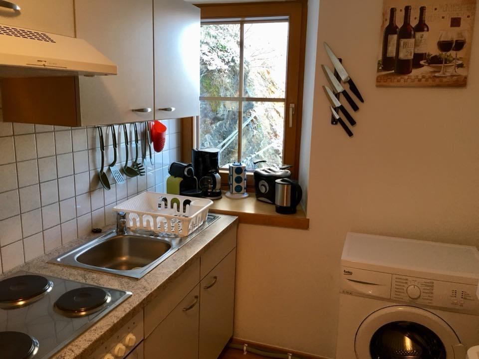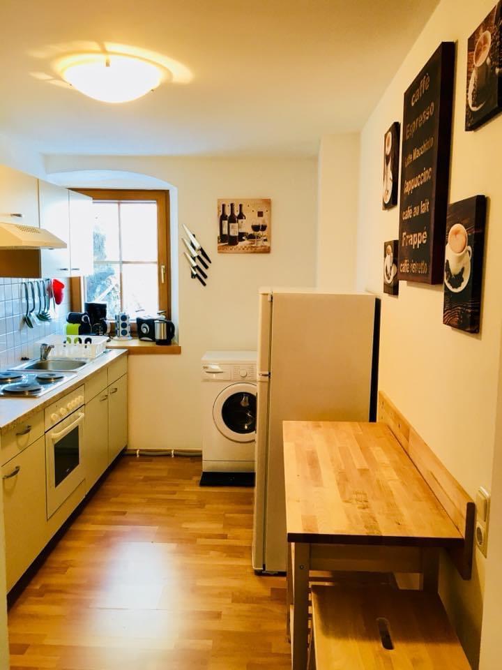 Voll ausgestattete Küche (Elektroherd, Backofen, Kühlschrank, Mikrowellenherd, Wasserkocher, Kaffeemaschine, Toaster, Geschirr)