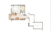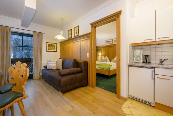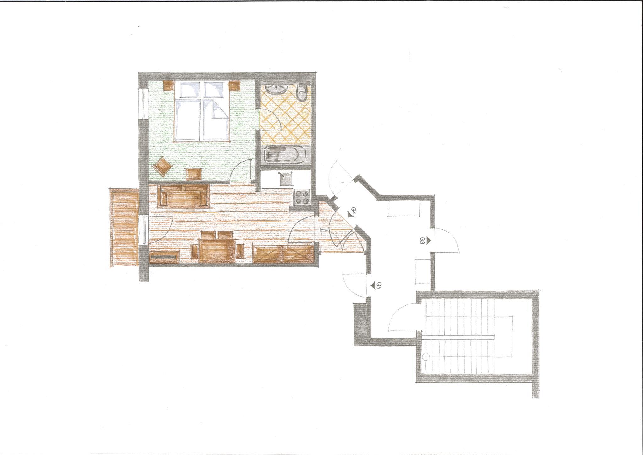 Dieses gemütliche Appartement verfügt über 1 getrenntes Schlafzimmer, eine Badezimmer mit Wanne und WC, einen Wohnraum mit voll ausgestatteter Küche und einen gartenseitigen Balkon.