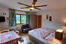 Gemütliches 25m² großes Studio für 1-3 Personen mit Balkon bietet einen Wohn-Schlafraum mit Kochnische und einsitzigem Sofa (ausziehbar), SAT-TV, ein Doppelbett, einen Esstisch mit Stühlen sowie ein Bad mit Dusche und WC. Ein Kinderbett oder einen Hochstuhl stellen wir Ihnen gerne kostenlos zur Verfügung. WLAN kostenlos! Auf Anfrage können noch ein Einzelzimmer oder ein Dreibettzimmer als Erweiterung zum Studio dazu gebucht werden.