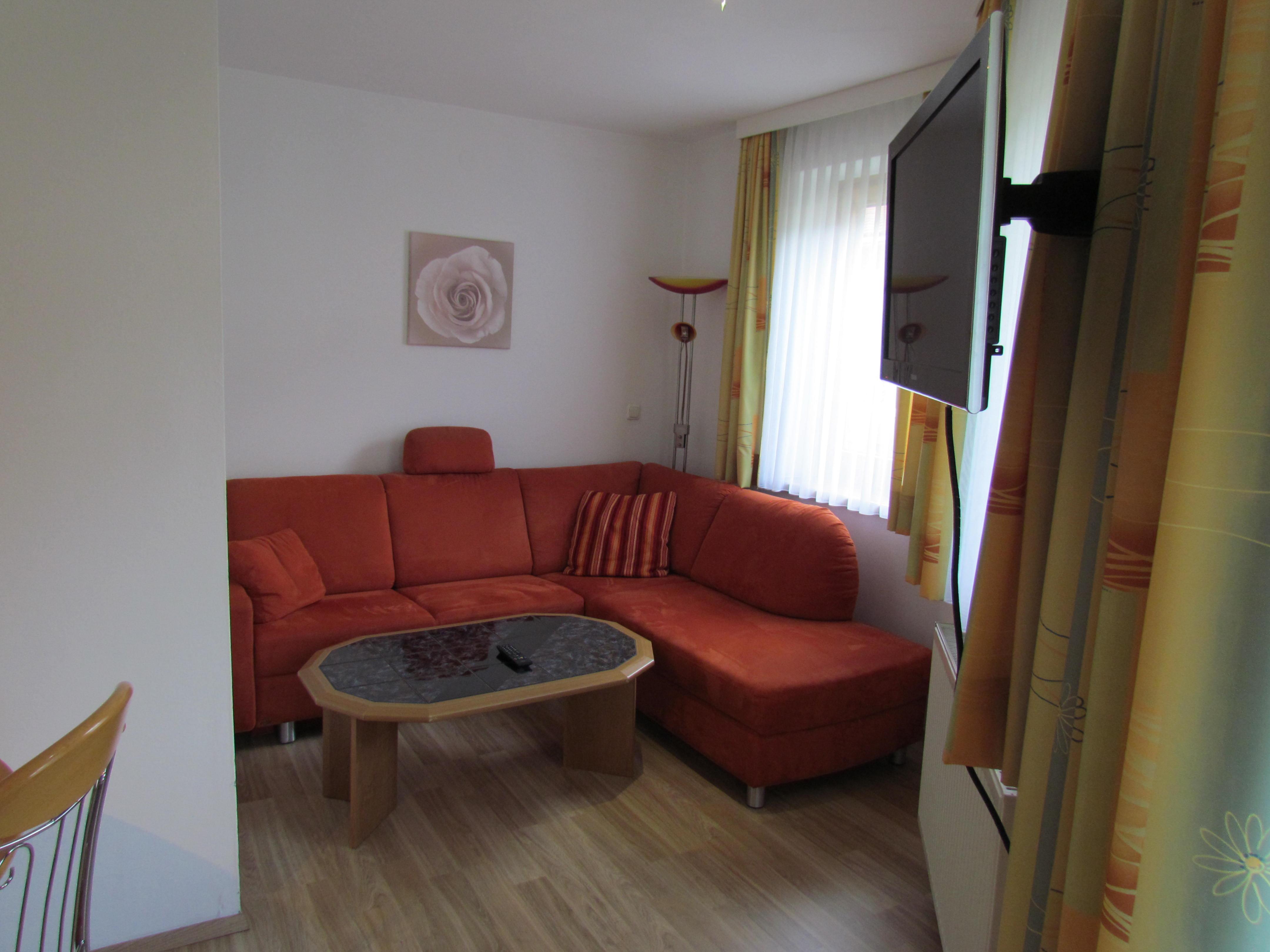 Appartement für 4-6 Personen, 57 m2, 2 Schlafzimmer, (1 Dreibett- u. 1 Doppelzimmer) 1 Wohnschlafraum, Dusche, WC, Kabel-TV, Balkon. Komplett ausgestattet inkl. Bettwäsche.