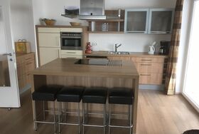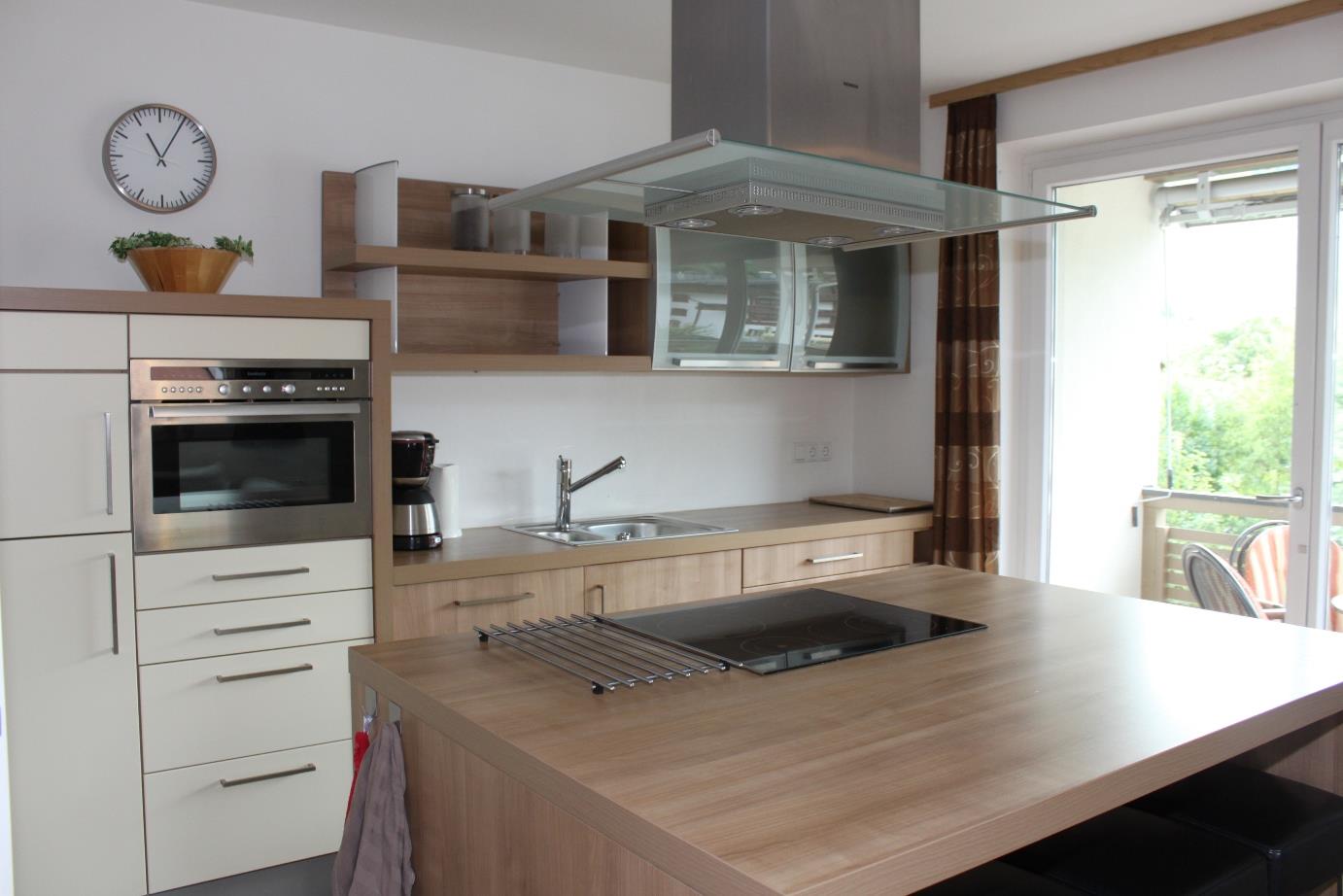 Die Küche ist eine moderne Wohnküche mit Kochinsel und 4 Barhockern, Kombinations-Mikrowelle, Geschirrspüler, Kaffeemaschine, Induktionsherd, Kühlschrank mit Gefrierfach.