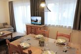Zur Ausstattung gehört: großzügiger Wohnraum mit Sofa, Schlafcouch, Essbereich, Faltscreen mit KabelTV, WLAN, vollwertige Küche (mit Kühl-Gefrierkombination, Geschirrspüler, Backrohr, 4er-Ceranfeld, Toaster, Wasserkocher, Tassimo-Kaffeemaschine, Geschirr, Reinigunngsutensilien, etc., ), ein Schlafzimmer mit Doppelbett und Bettwäsche, Badezimmer mit Dusche & WC, sowie ein Balkon mit Sitzmöglichkeit und teilweise Seeblick.