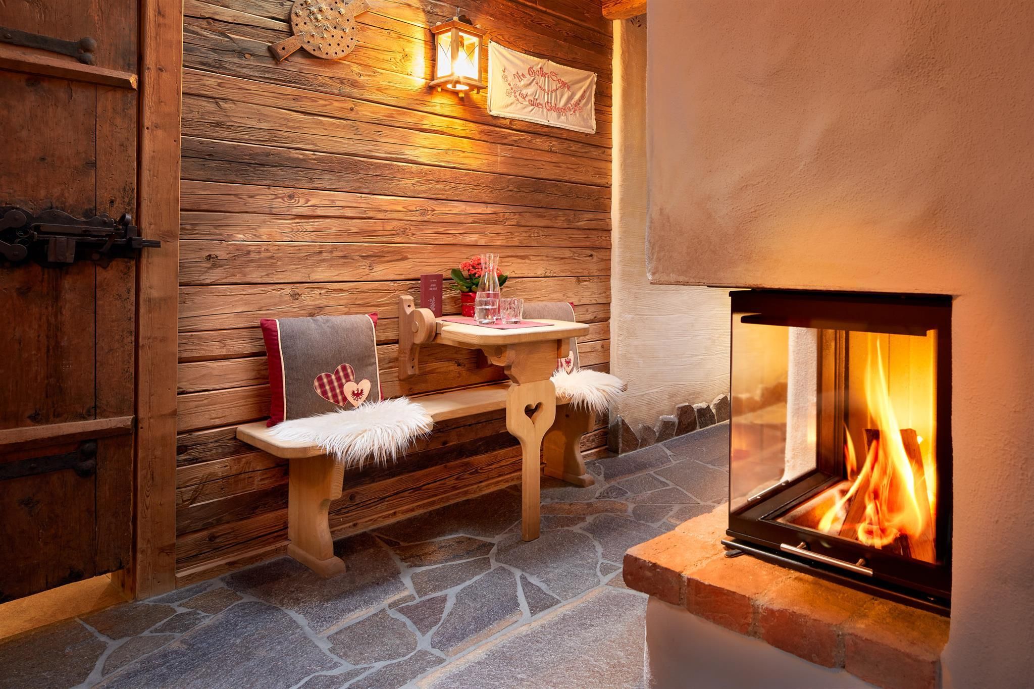• Stube mit einem großen und einem kleinen Esstisch/Sitzecke, offener Kaminofen