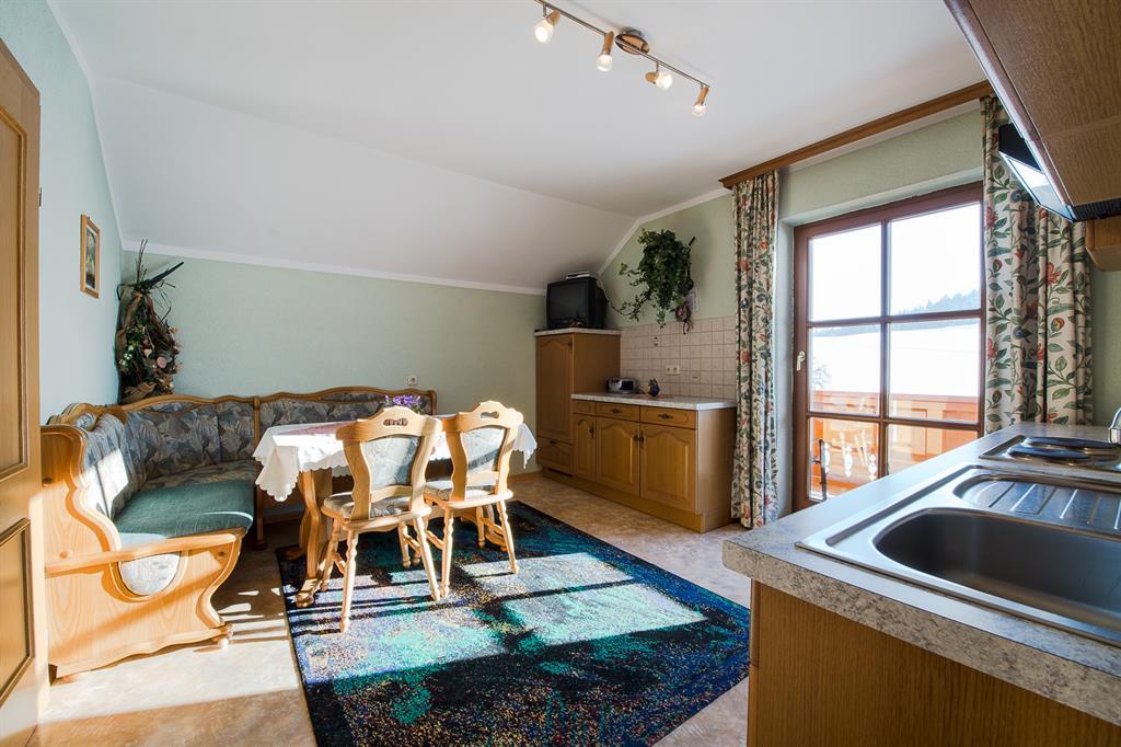 Ferienwohnung mit Balkon, 2 getrennte Schlafzimmer, Wohnküche komplett eingerichtet mit Radio, TV, Mikrowellenherd, Küchenblock; Dusche und WC getrennte Räume. Blick auf die Abtenauer Bergwelt. Bettwäsche, Handtücher, Badetücker inkl.