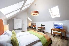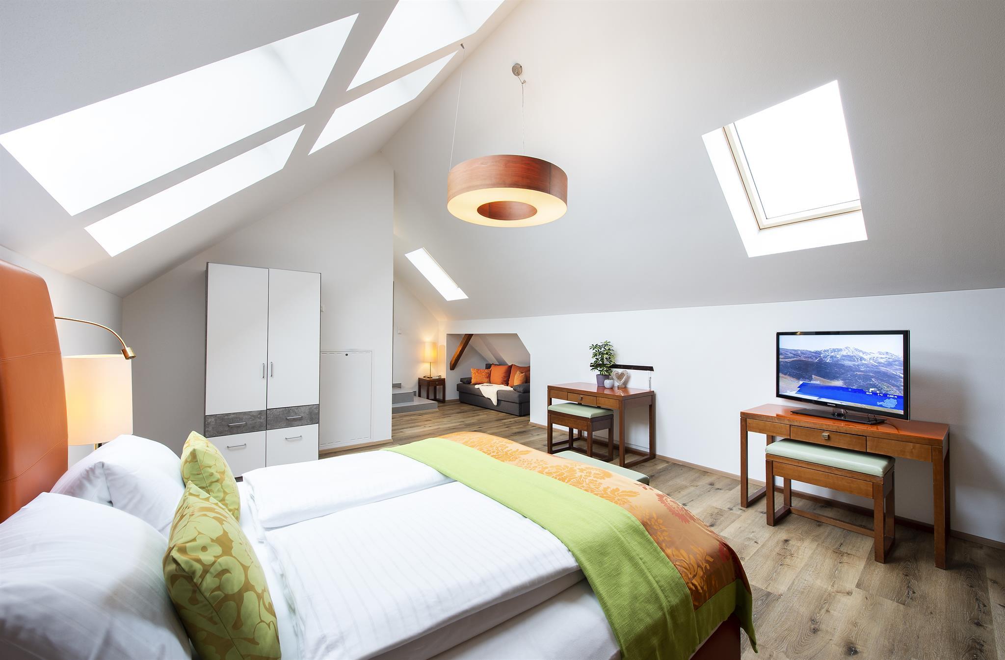 Das Dachgeschoss-Appartement ist ca. 90 qm groß und bietet ein großes Schlafzimmer, ein Bad mit Dusche und WC sowie eine voll ausgestattete Wohnküche.