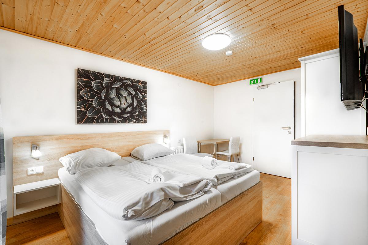 Das Doppelzimmer ist ausgestattet mit einem Doppelbett. Es verfügt über ein Badzimmer mit DU, WC sowie HD TV und freies WLAN.