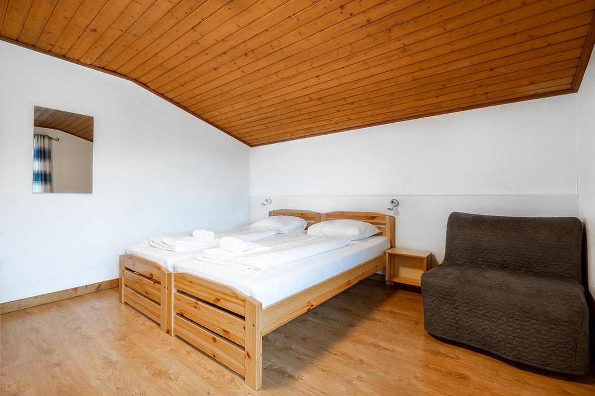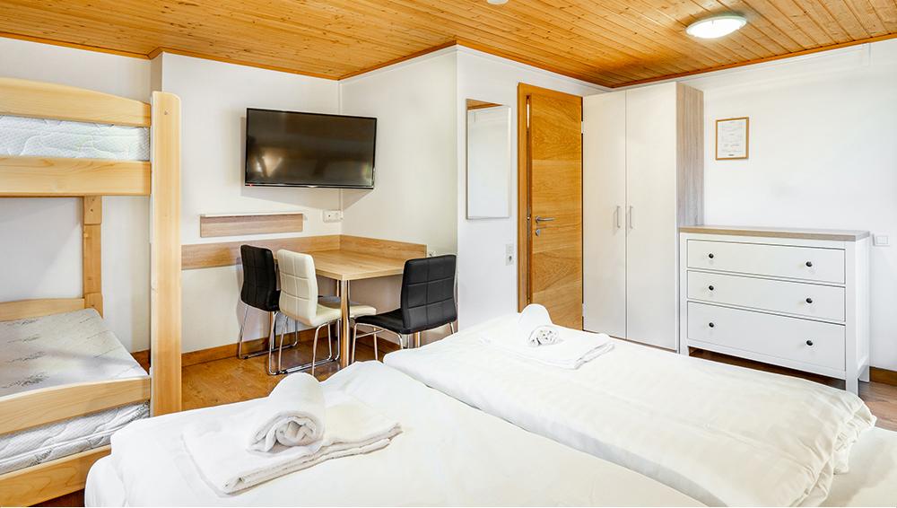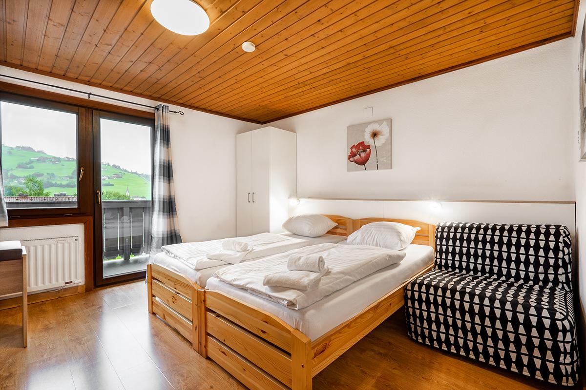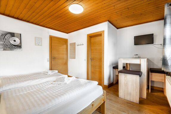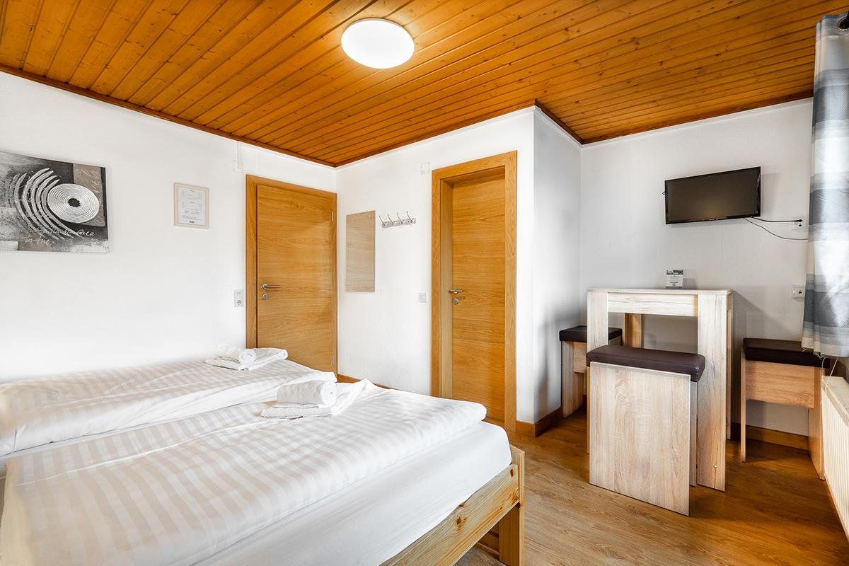 Das Doppelzimmer ist ausgestattet mit einem Doppelbett und einem ausziehbarem Sofa für 1 Person. Es verfügt über ein Badzimmer mit DU, WC sowie HD TV und freies WLAN.