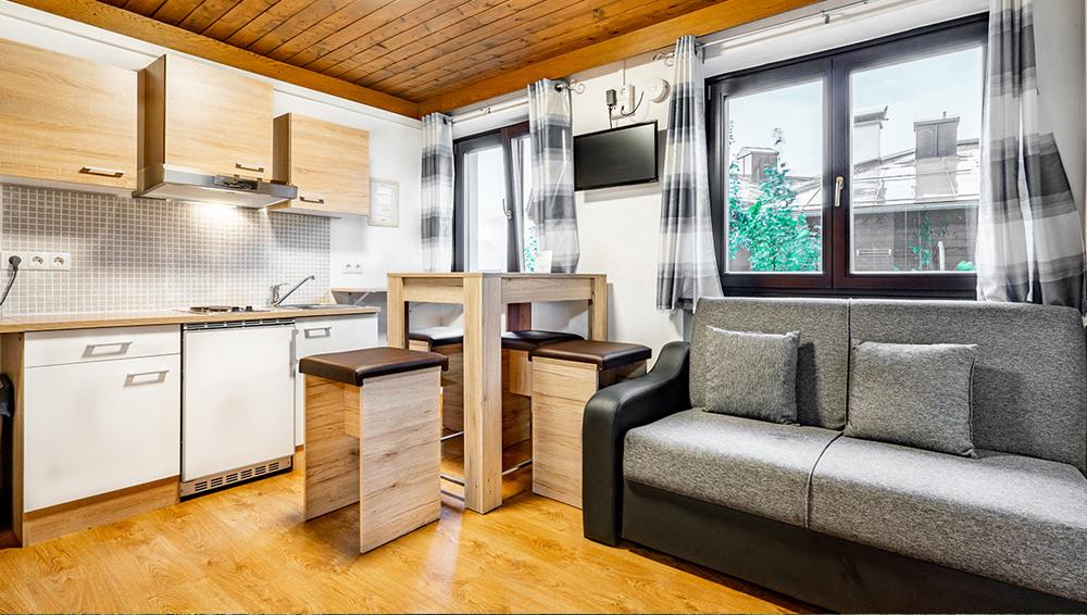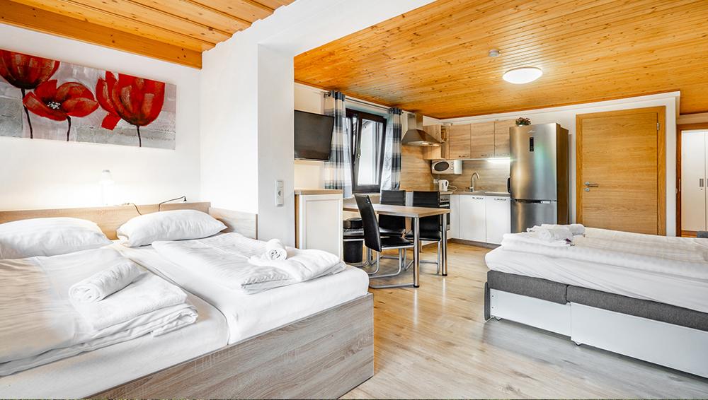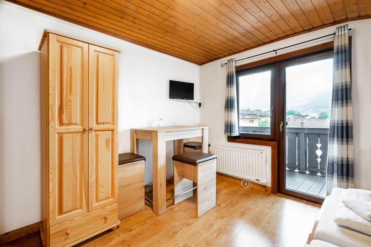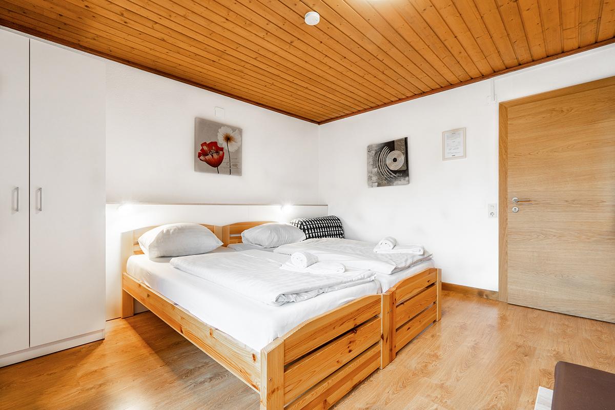 Das Doppelzimmer ist ausgestattet mit einem Doppelbett und einem ausziehbarem Sofa für 1 Person. Es verfügt über ein Badzimmer mit DU, WC sowie HD TV und freies WLAN.