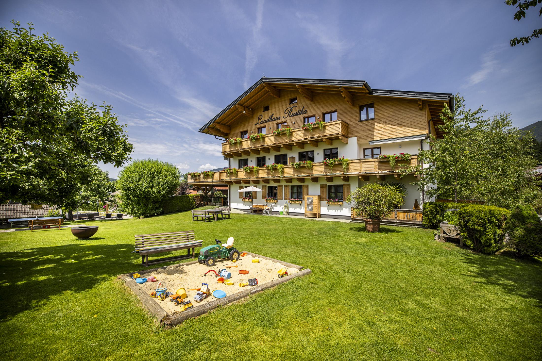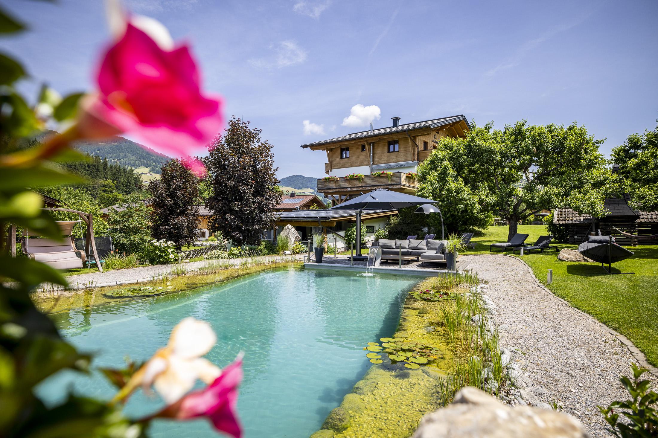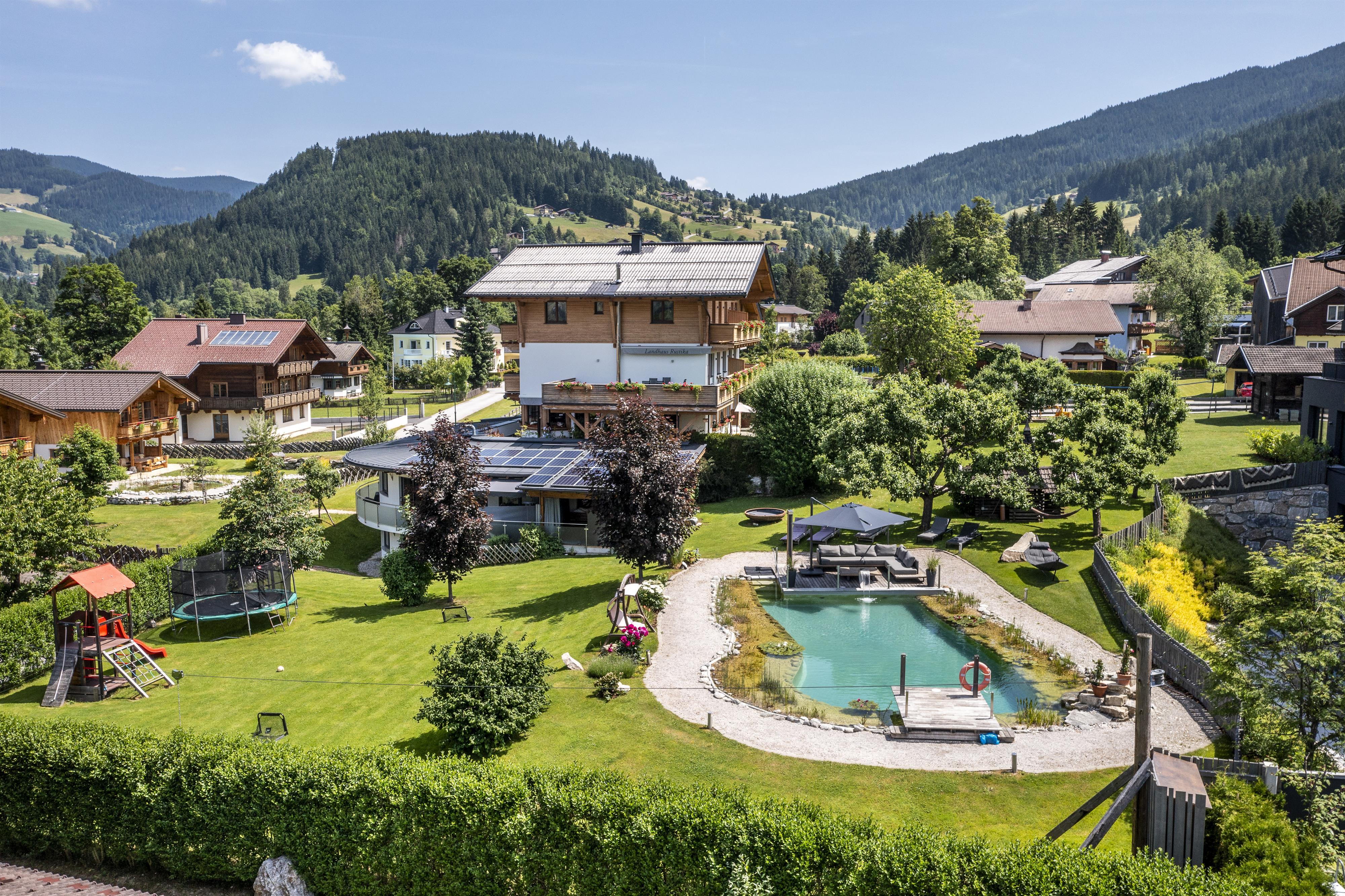 Das Landhaus Rustika befindet sich in ruhiger Lage am Sonnenplateau von Wagrain - Kirchboden. Die großzügige Gartenanlage mit Naturschwimmteich 10 x 11 Meter, Kneipppfad, Spielplatz, Tischtennis, Fischteich, Streichelzoo und Liegewiese lädt zum Entspannen und Erholen ein.
