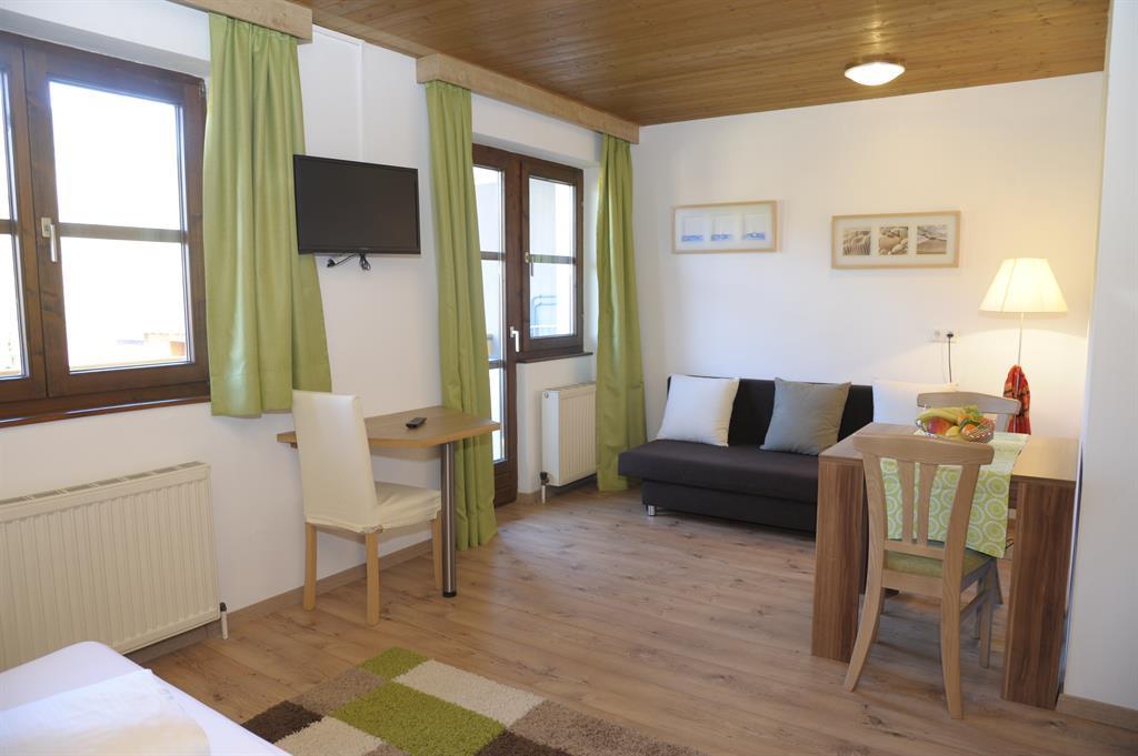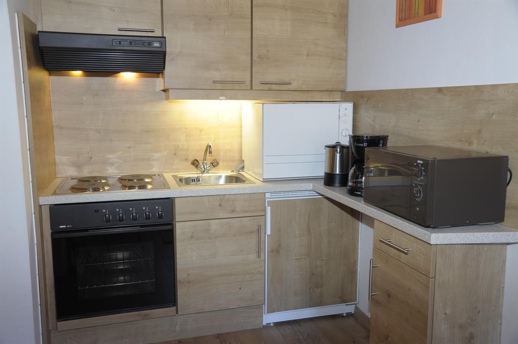 Wohnküche komplett mit Essecke, Du/WC, Kabel-TV, Radio, Telefon, Vorraum mit Garderobe, Balkon.
