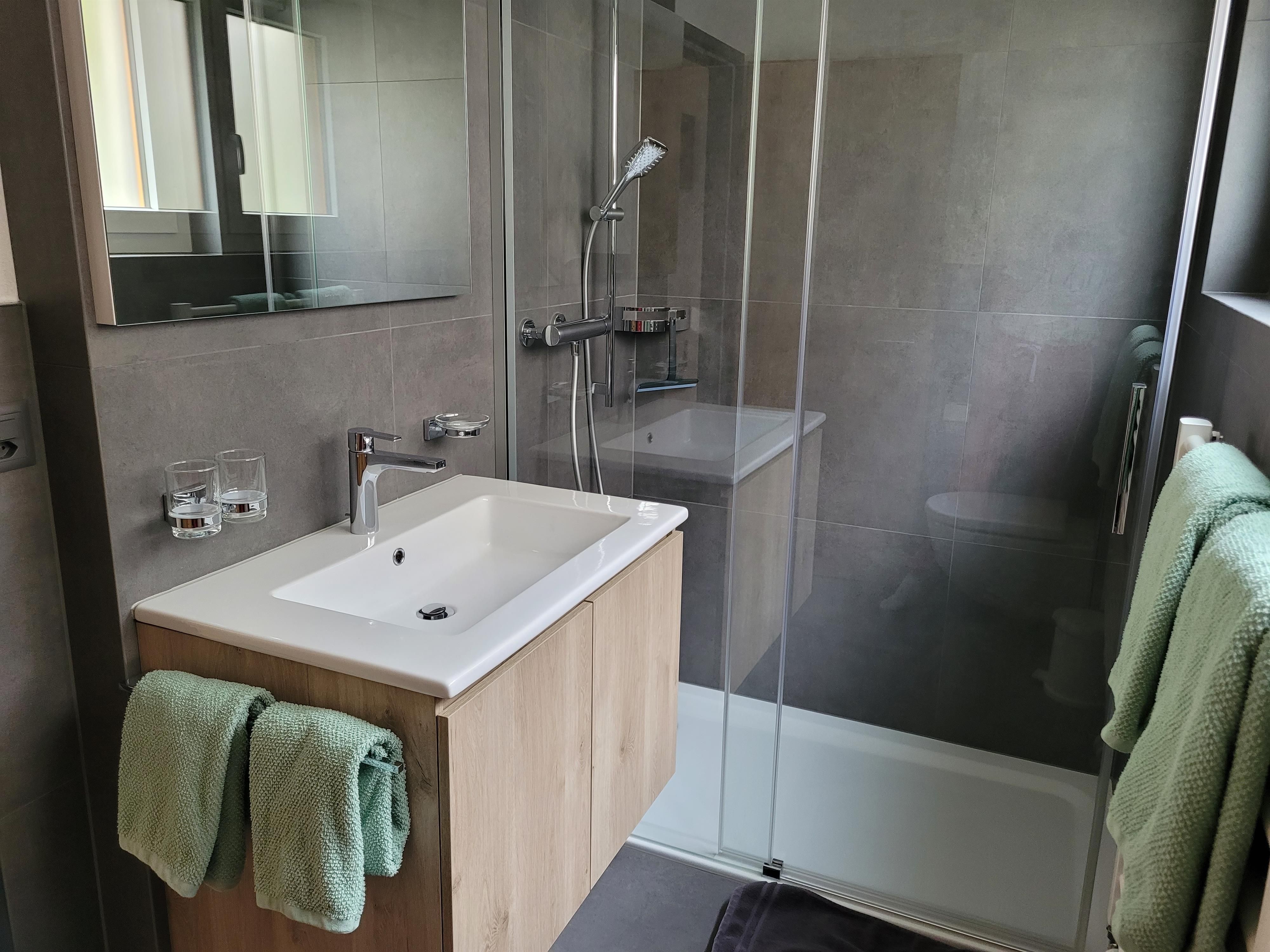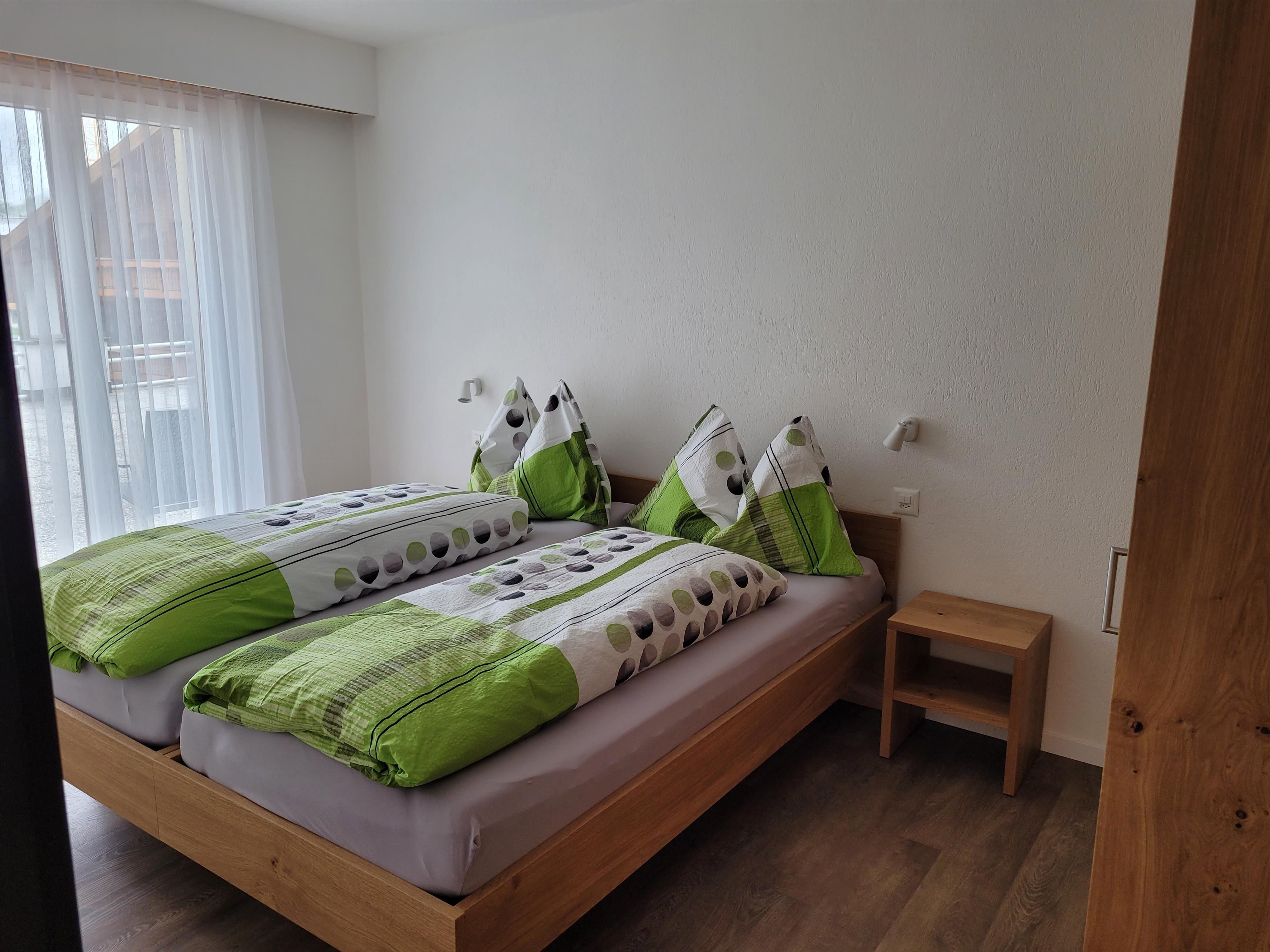 Das Wohn-/Esszimmer verfügt über ein gemütliches Einzelbett, während das separate Schlafzimmer mit zwei bequemen Einzelbetten und einem eigenen Waschbecken ausgestattet ist. Die praktische Kochnische bietet alles, was Sie zum Kochen benötigen – inklusive Geschirrspüler, Fondue-Set und Delizio-Kaffeemaschine. Das Badezimmer ist mit Bad/WC ausgestattet. Radio, Fernseher und WLAN stehen Ihnen selbstverständlich zur Verfügung.