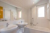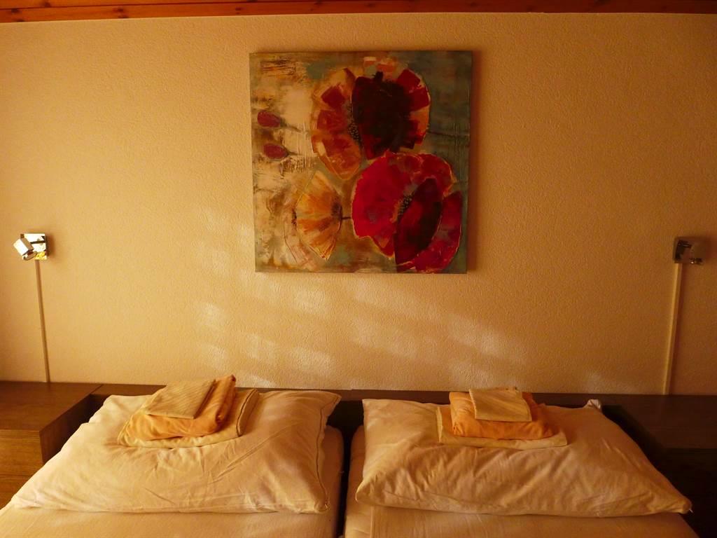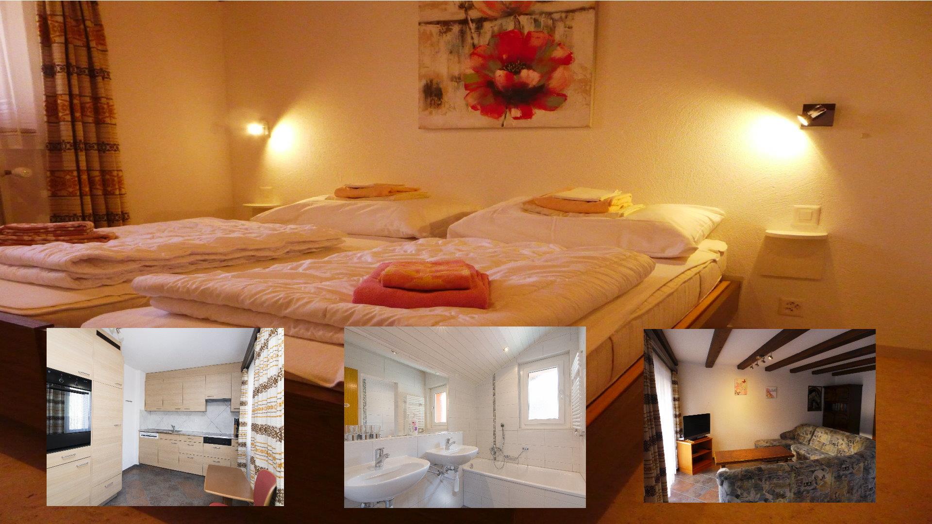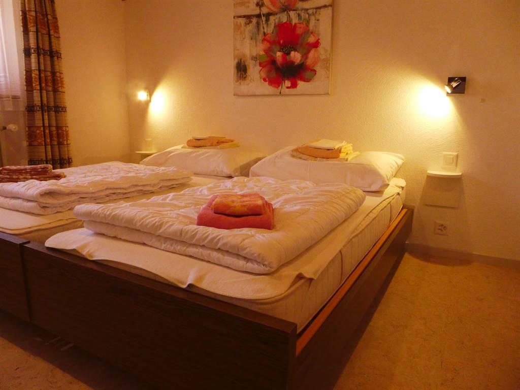 Im Obergeschoss: 2 Zimmer mit je 2 Bett und Ausgang zu Südbalkon; 1 Zimmer mit 2 Betten. Bett- und Toilettenwäsche ist vorhanden und im Preise inbegriffen. Dusche/WC und Bad.